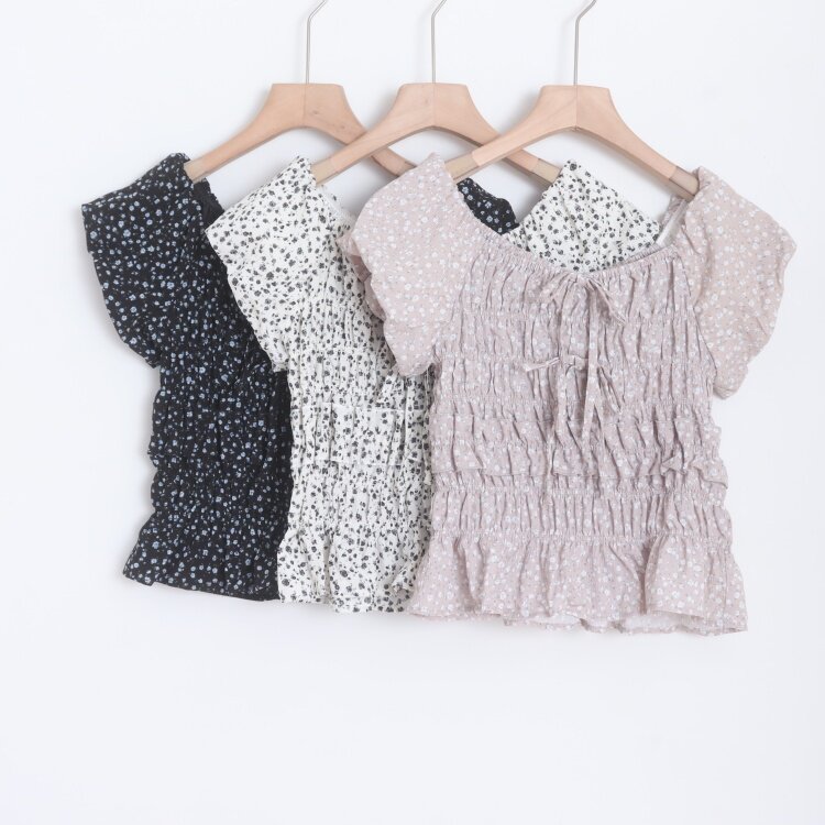 首页> 女装> D18074日单新款客供料松紧领系带套头显瘦女碎花甜美泡泡短袖衬衫