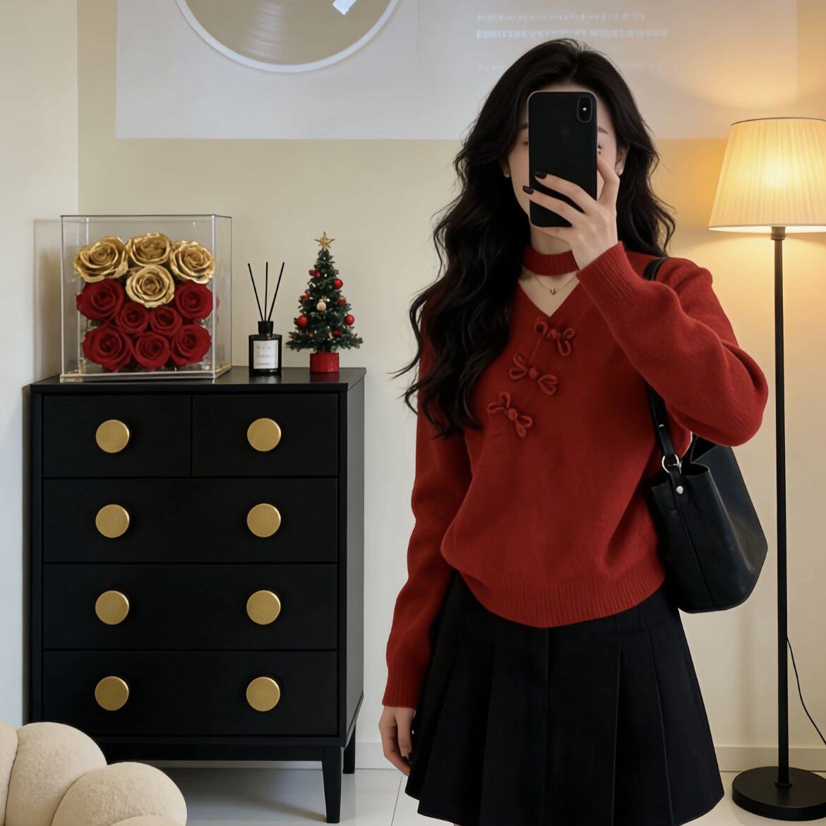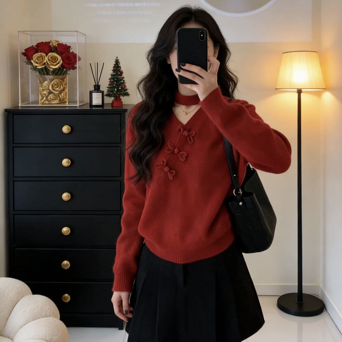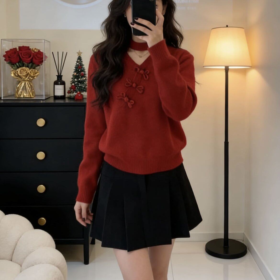 包邮新年红色新中式复古盘扣V领上衣内搭打底针织衫女秋冬