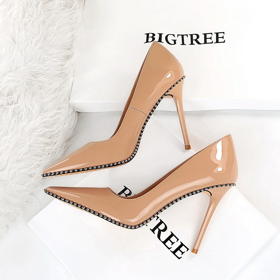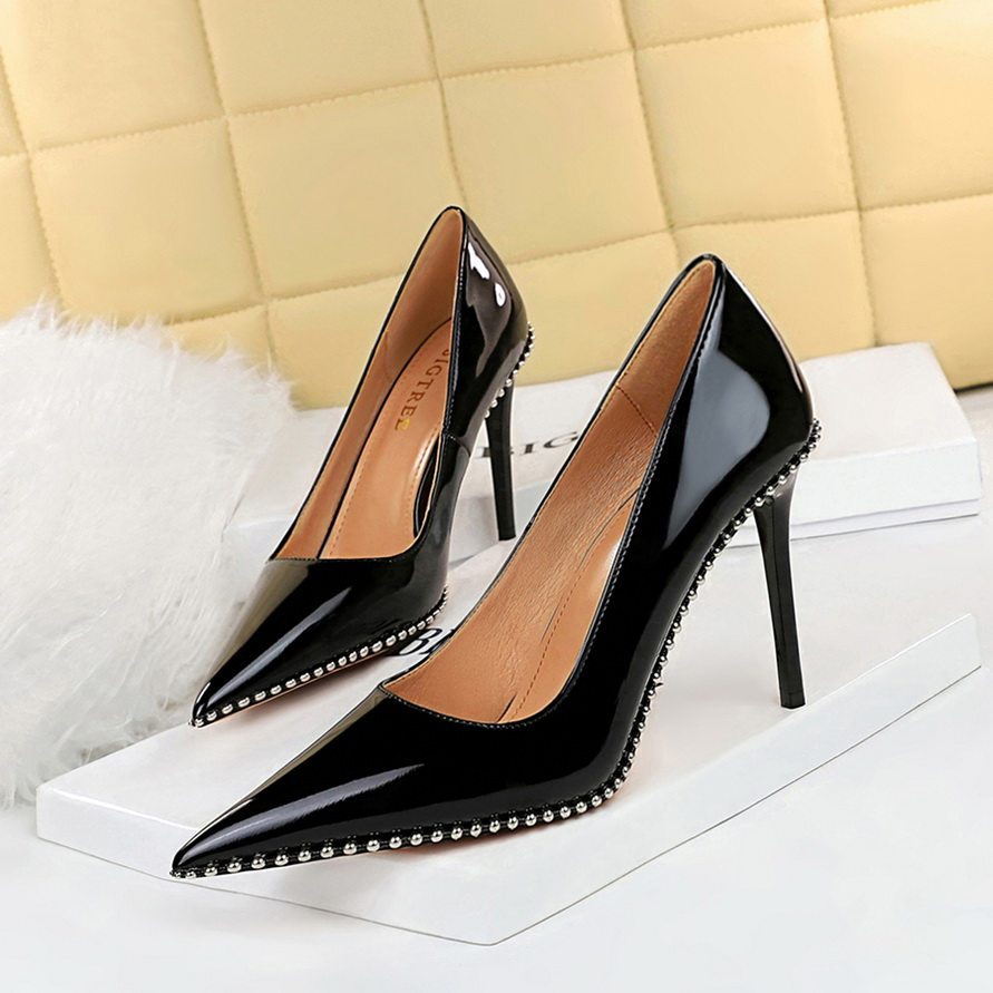 9611-2欧美性感超高跟复古金属链子铆钉漆皮浅口尖头高跟鞋女单鞋