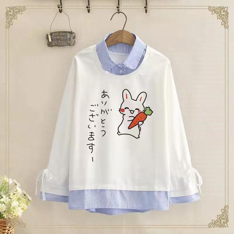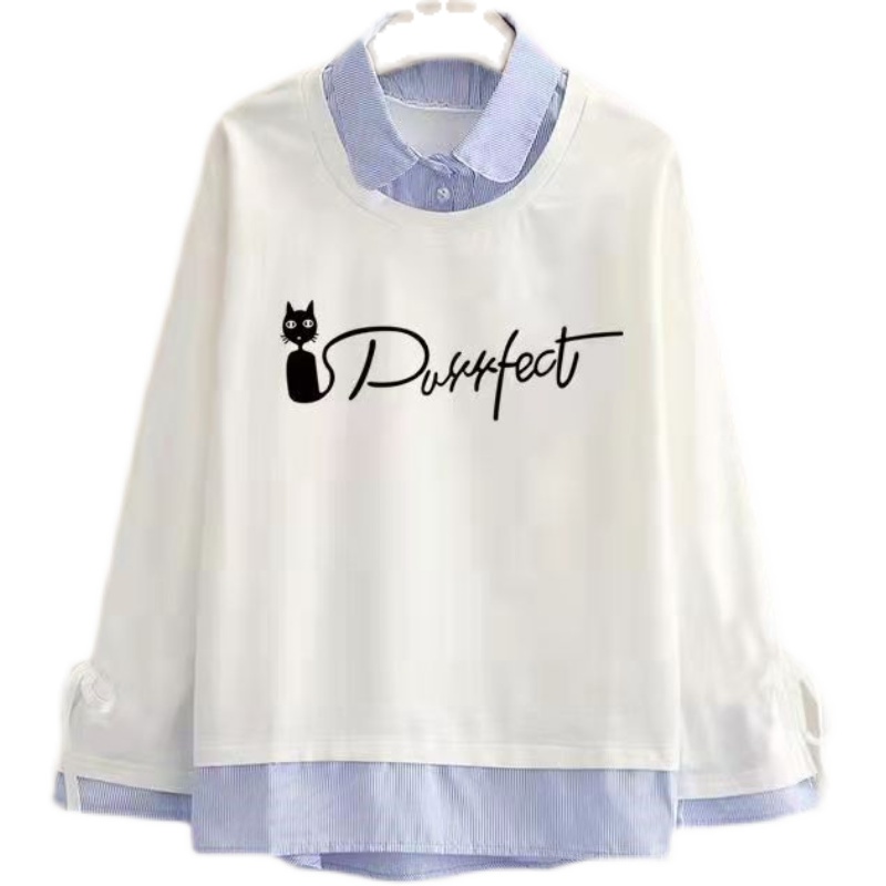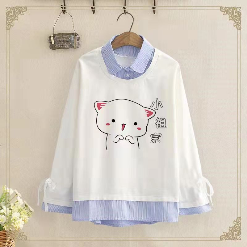棉假两件长袖POLO衬衫领初中学生T恤春秋季卡通上衣少女打底衫