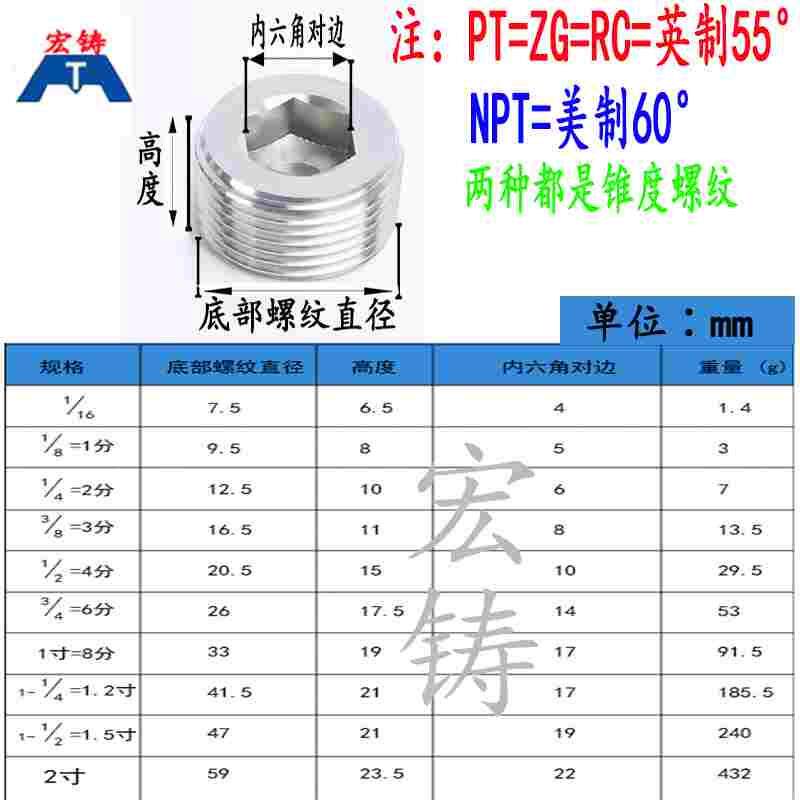 316L不锈钢内六角外丝堵头PT管堵NPT螺塞RC丝堵ZG堵头闷头4分6分