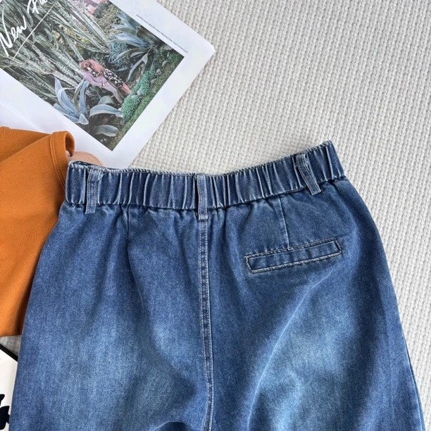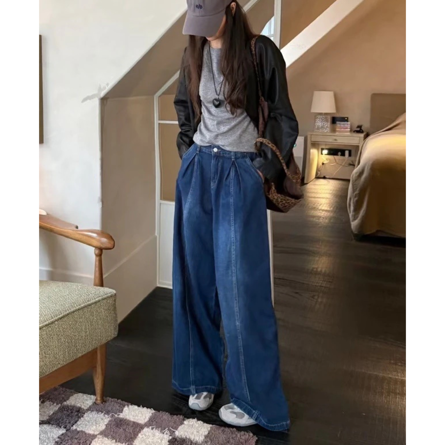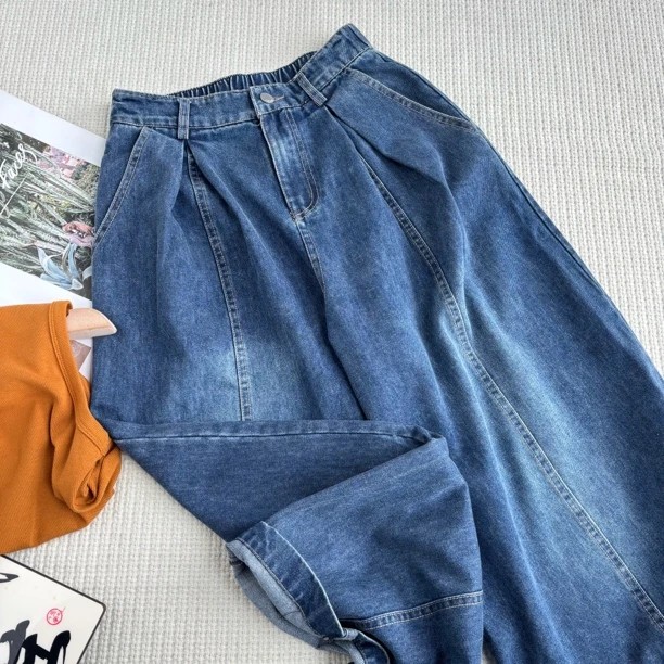 秋季新款韩版怀旧百搭时尚复古港风松紧腰阔腿直筒牛仔裤7607 G