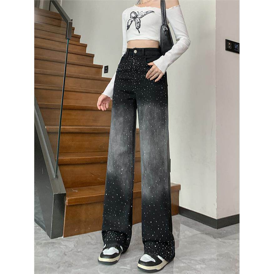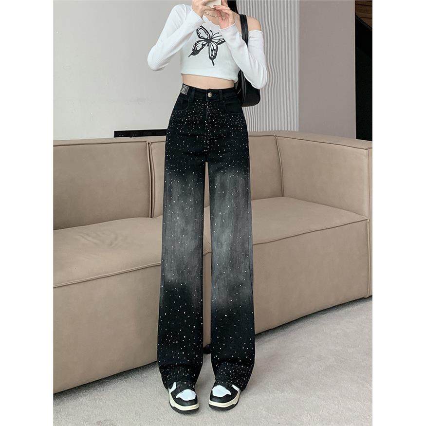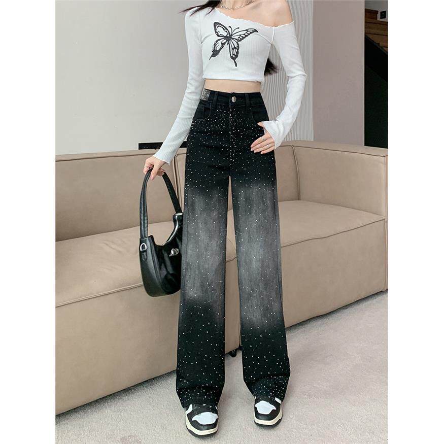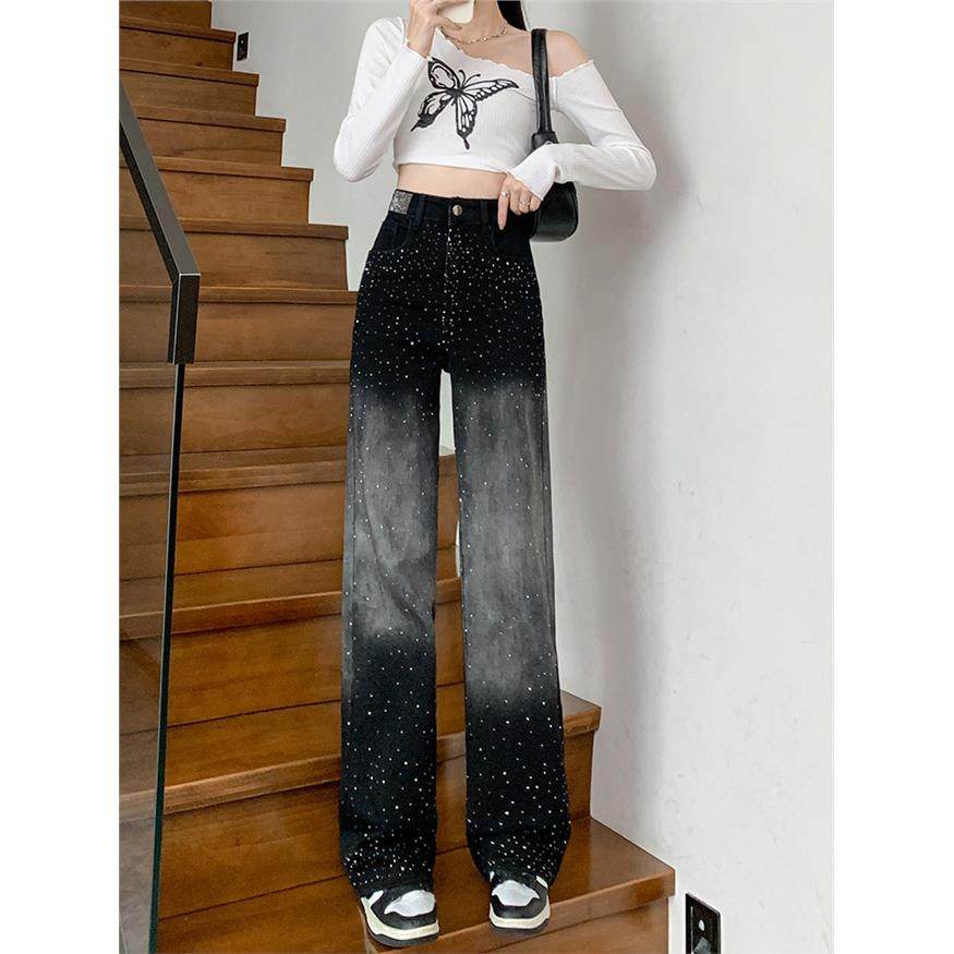 烫钻牛仔裤女渐变色黑色2025春秋新款气质亮闪闪带钻阔腿直筒裤子