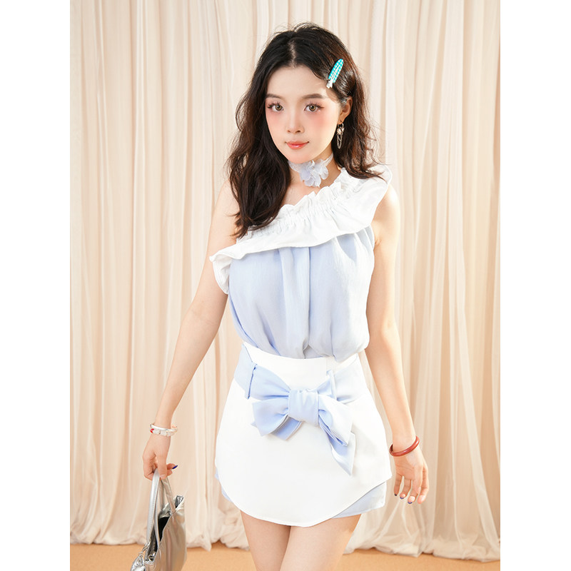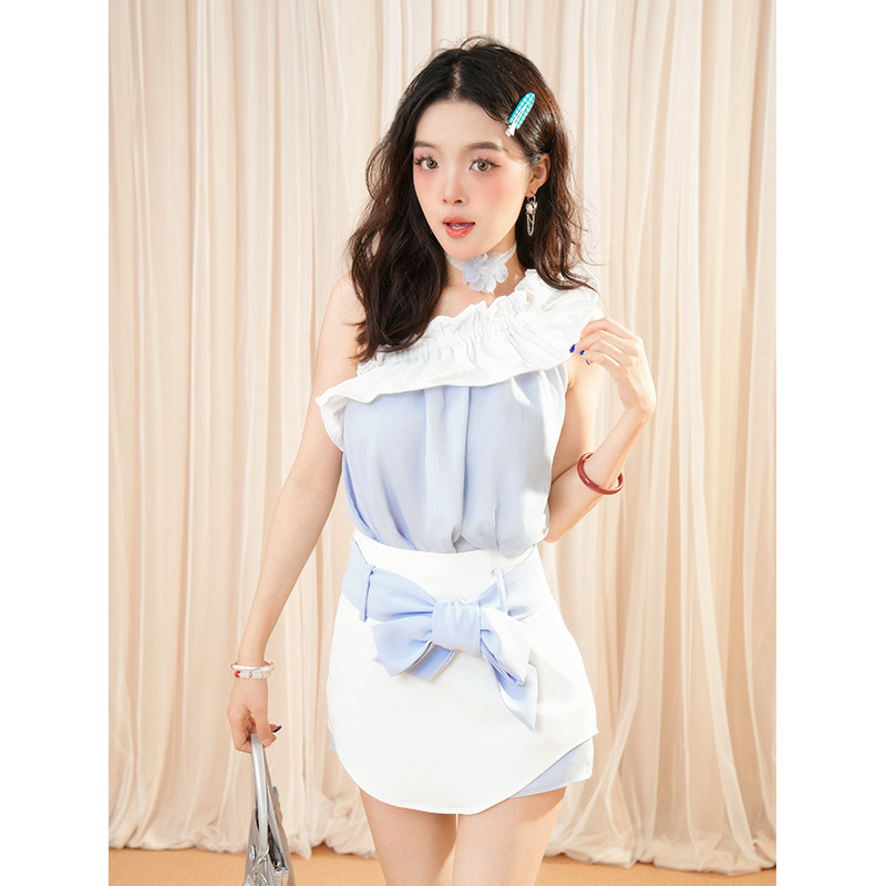 【蓝调梦境】 高级淑女风套装斜肩设计拼接上衣A字白色短裙两件套