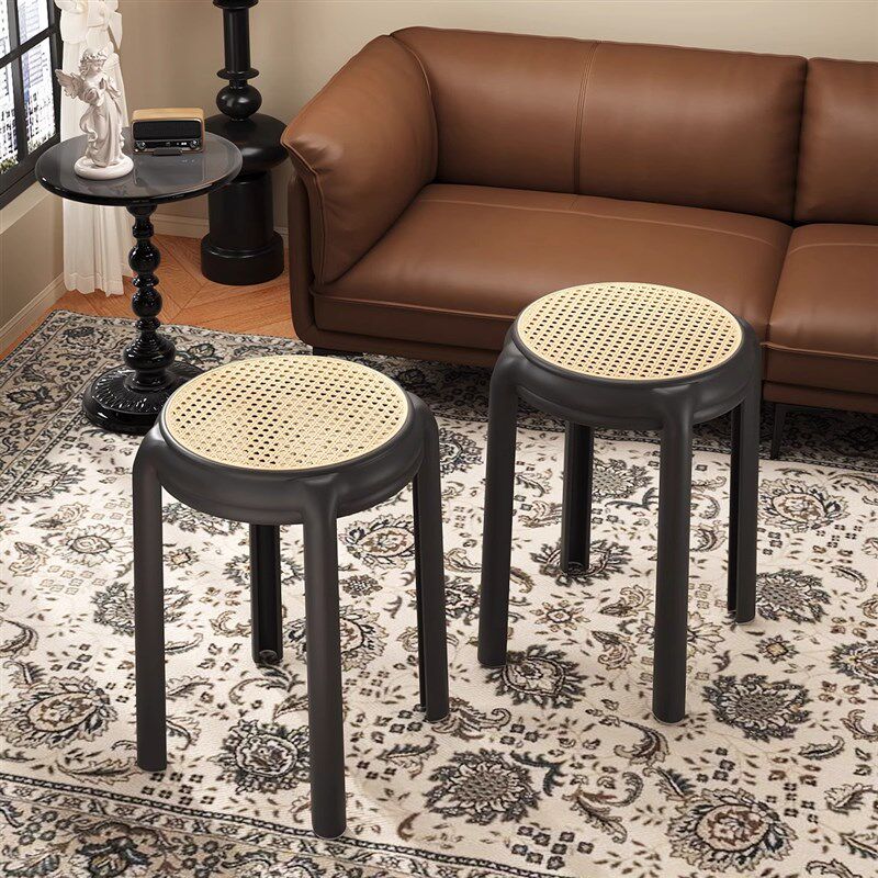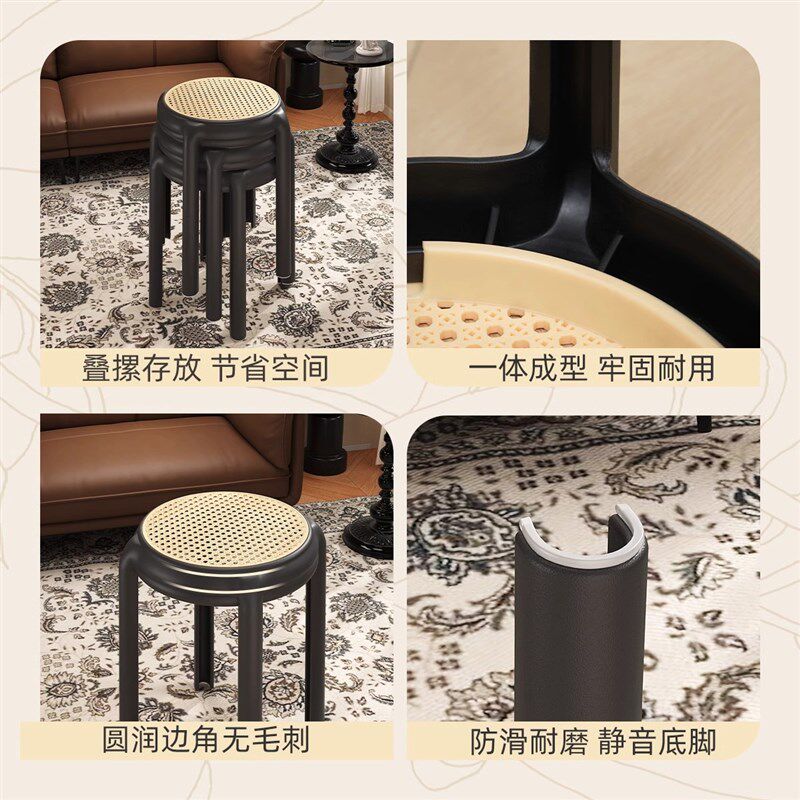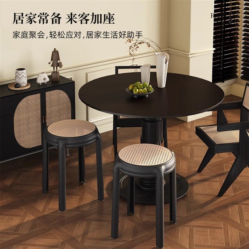 塑料复古凳子家用加厚可叠放藤编圆凳客厅中古高板凳餐桌备用椅子