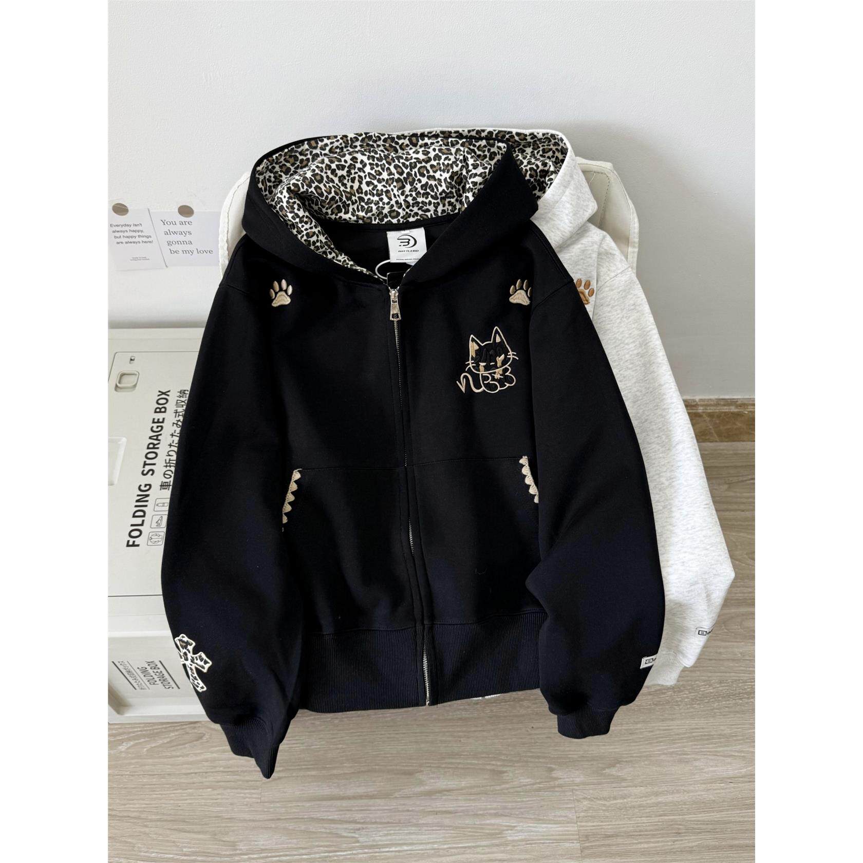 Nuneon美式覆古开衫拉炼外套豹纹恶魔秋冬宽松加绒连帽卫衣女情侣