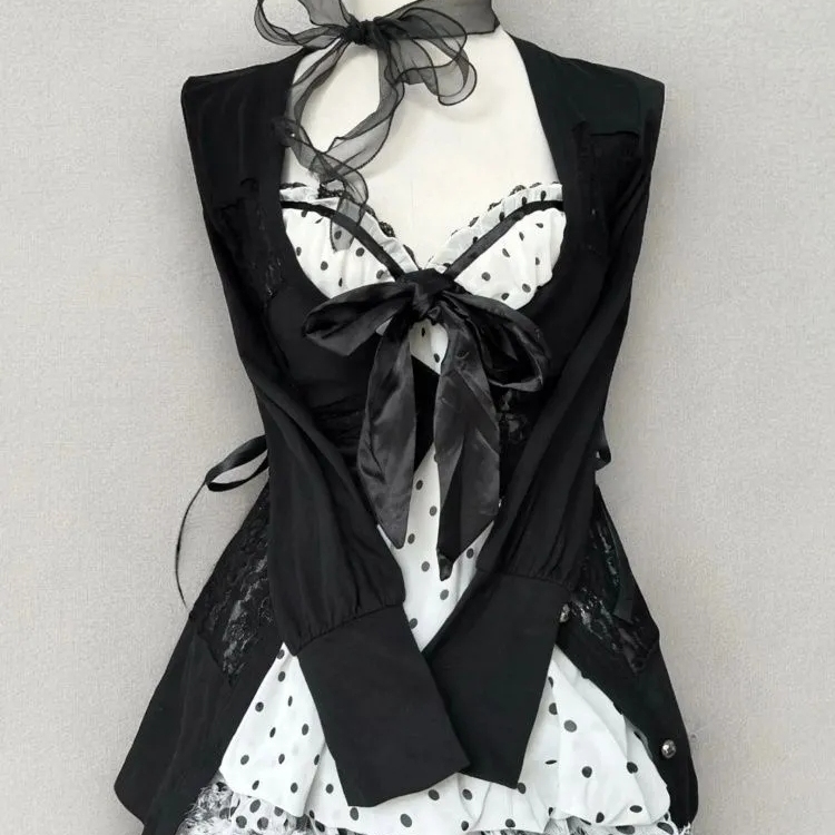 古早风古着套装女秋季新款蝴蝶结波点吊带气质开衫蕾丝半裙三件套