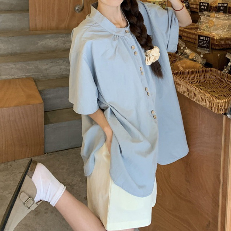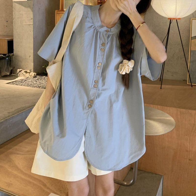 时尚女装两件套 日系减龄褶皱设计感蓝色短袖衬衫卡其色休闲短裤
