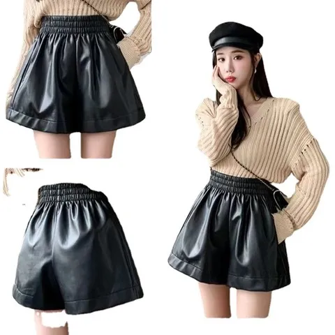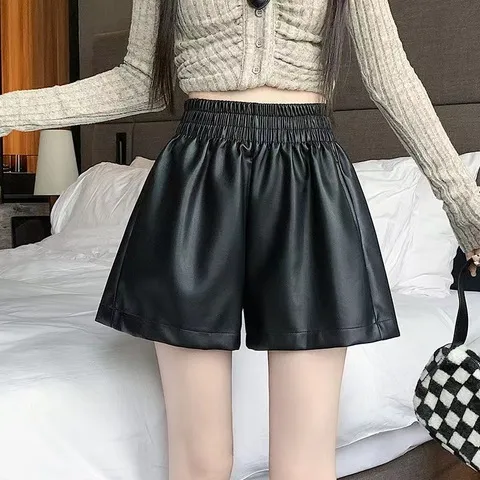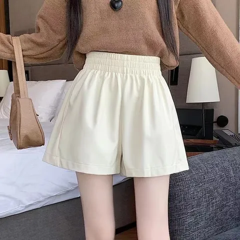 a字阔腿裤白色新款高腰短裤女PU皮裤2023外穿松紧腰靴裤冬天秋款