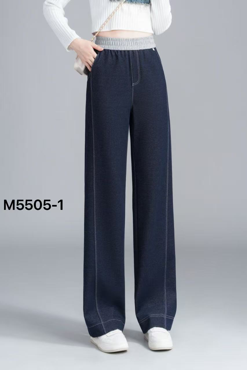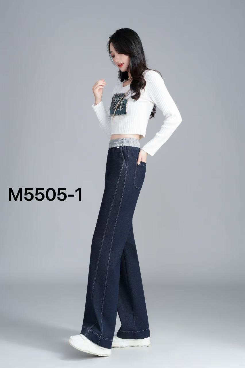 梦多姿5505高腰拼色窄版直筒松感牛仔裤女2025年新款松紧腰阔腿裤