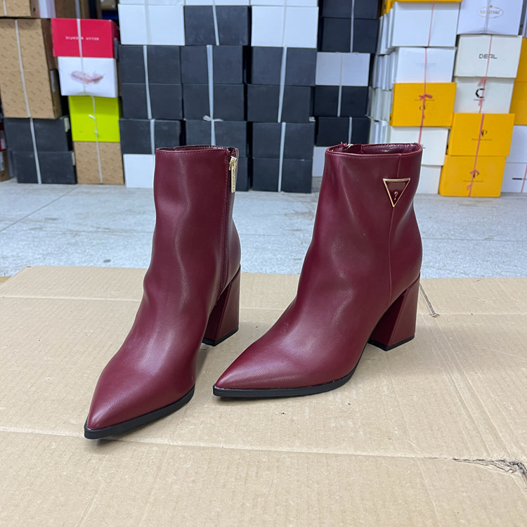 外贸原单女靴新款时尚尖头纯色粗高跟三角标百搭时装短靴瘦瘦靴