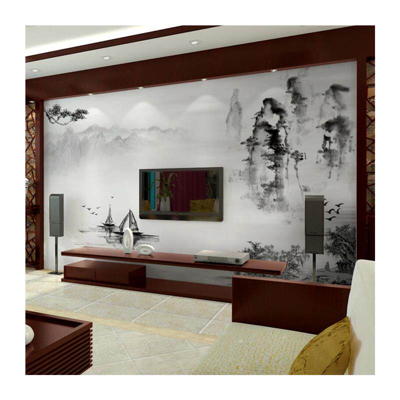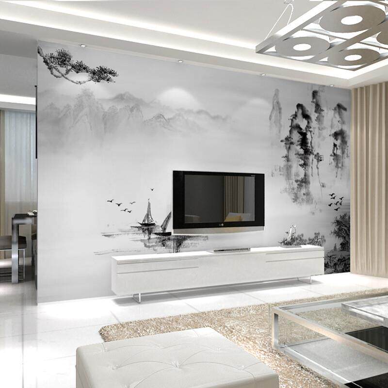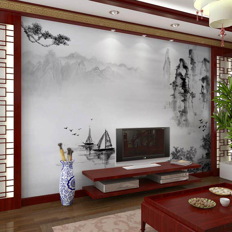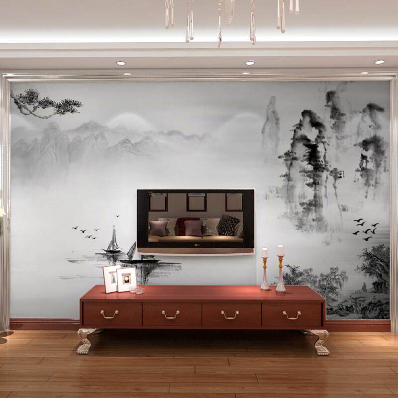 六纹鱼中式电视背景墙壁布黑白水墨山水壁纸客厅影视墙布无缝装饰