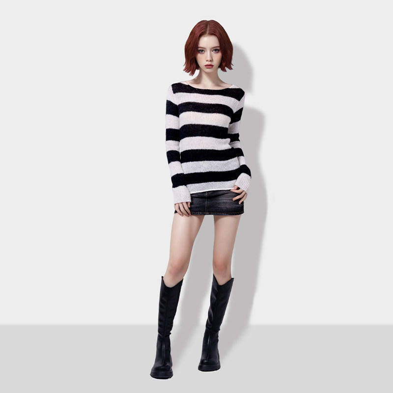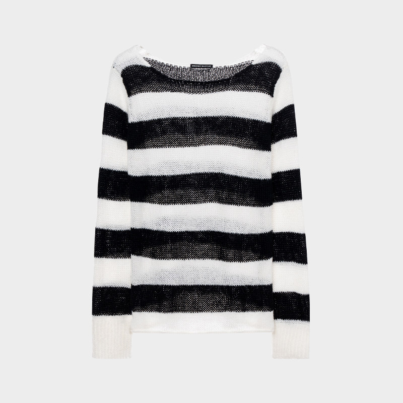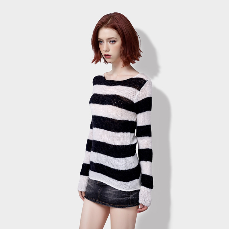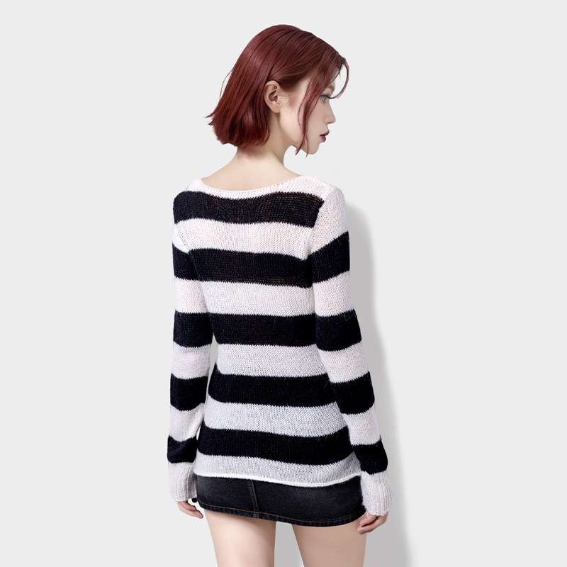 BF针织毛衣镂空圆领2024初秋新款一字领马海毛黑白条纹慵懒风毛衣