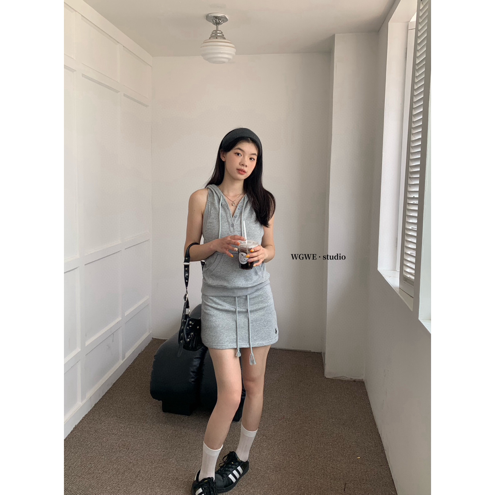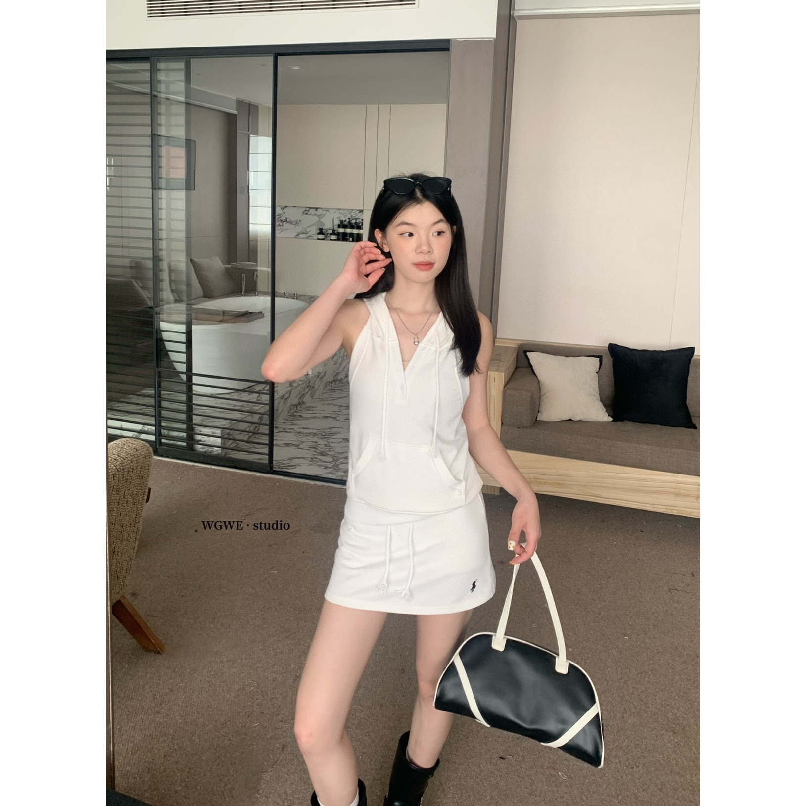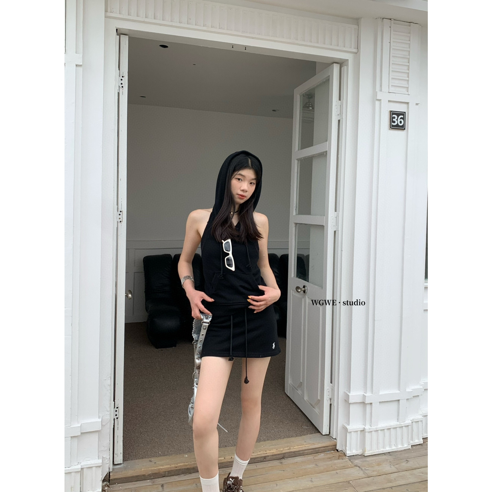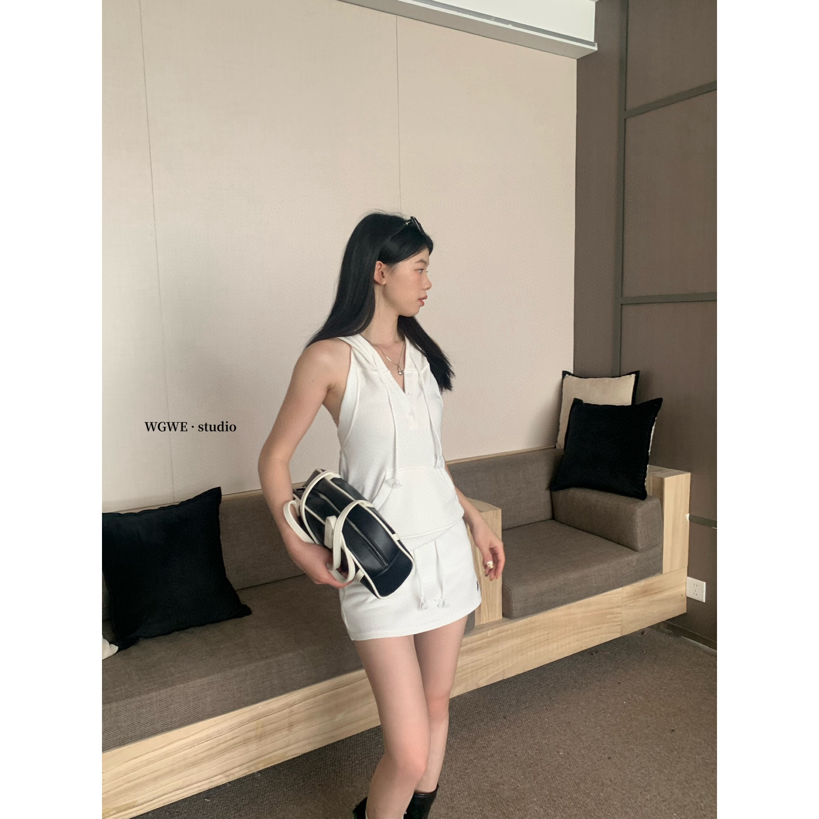 【WGWE】休闲运动风新款辣妹露背连帽短款背心+高腰包臀半身裙套