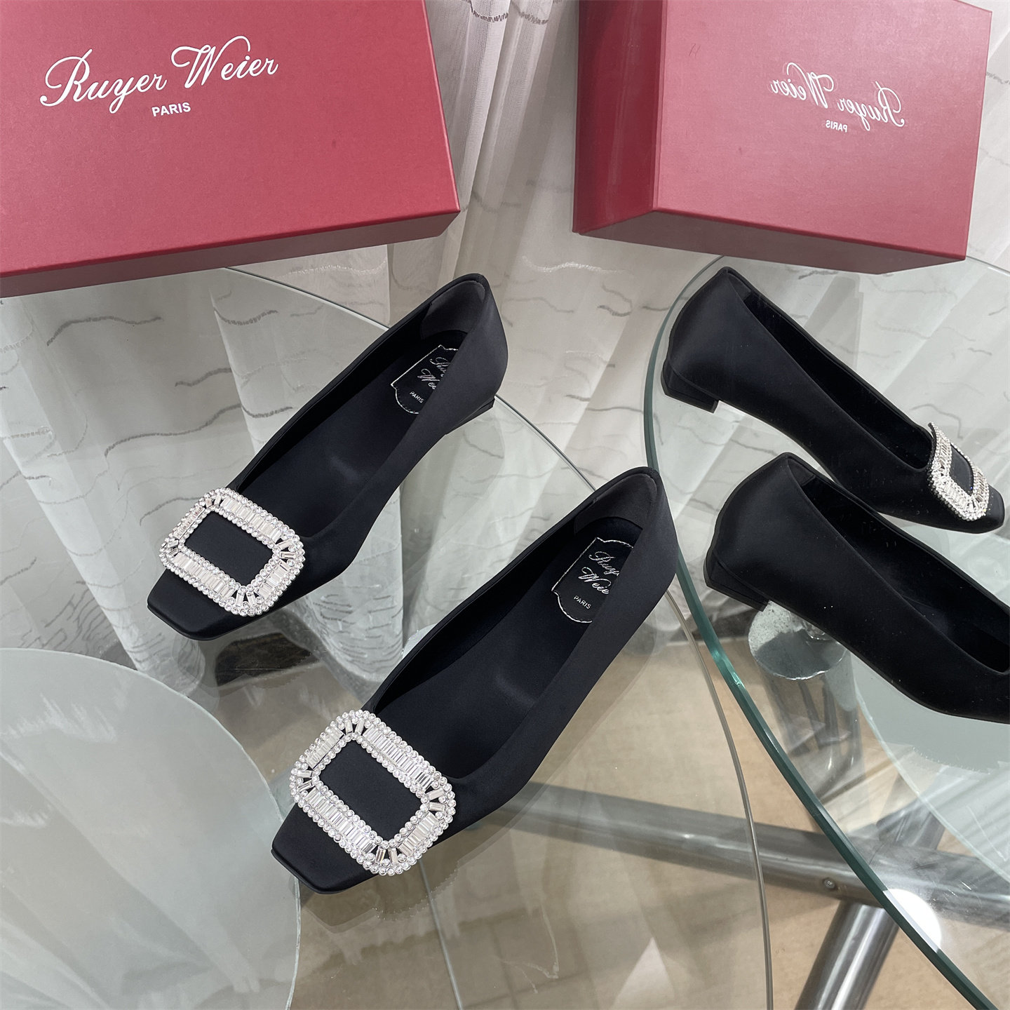 2026开春经典通勤百搭浅口女单鞋rv水钻方扣平跟方头粗跟平底女鞋