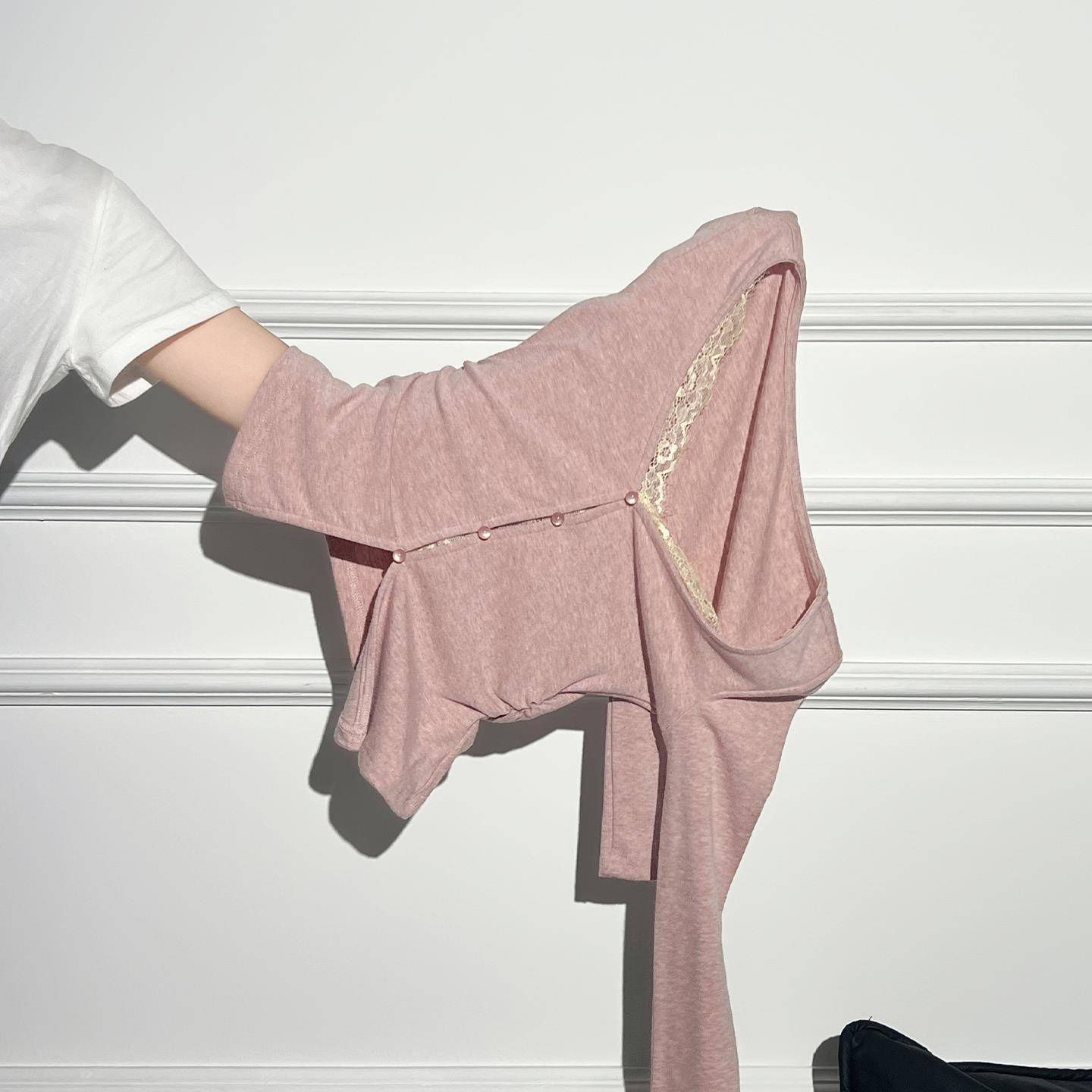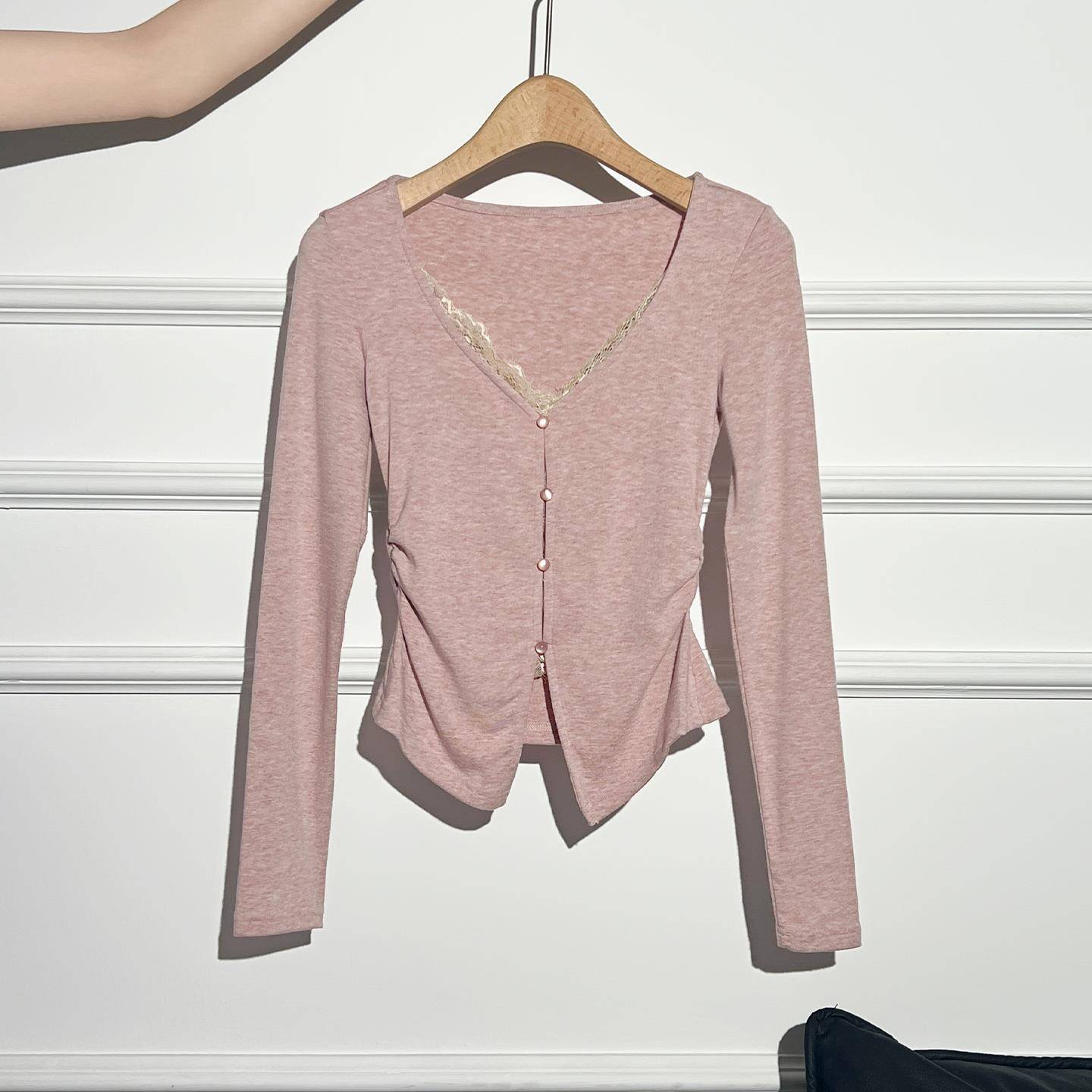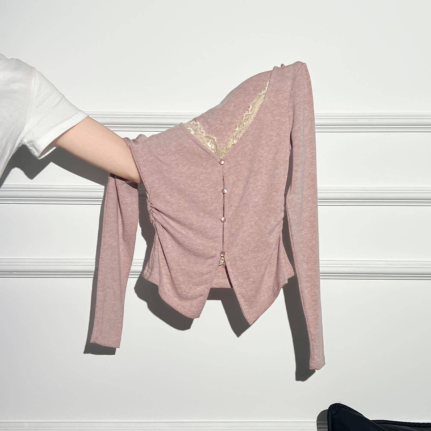 Aiyazhe辣妹蕾丝假两件v领长袖t恤女2025早秋内搭褶皱打底衫上衣