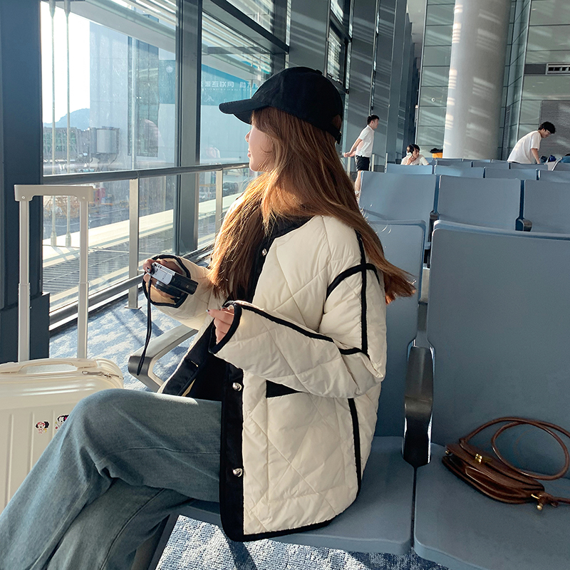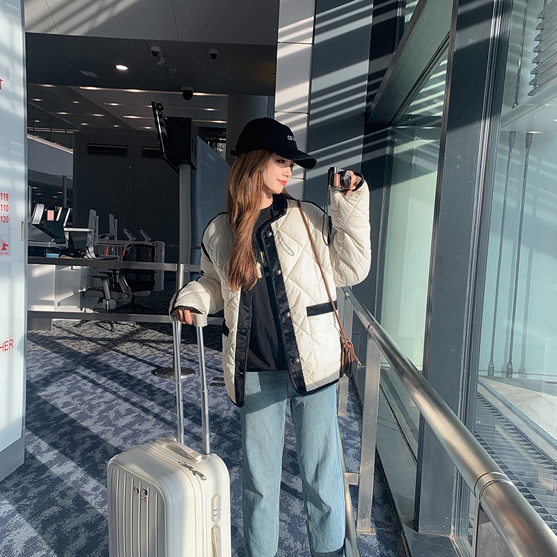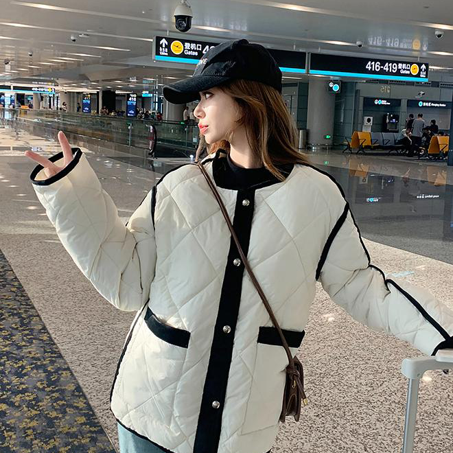 山茶花丝绒感撞色边菱格压纹2025新款羽绒棉服女小香风棉衣外套