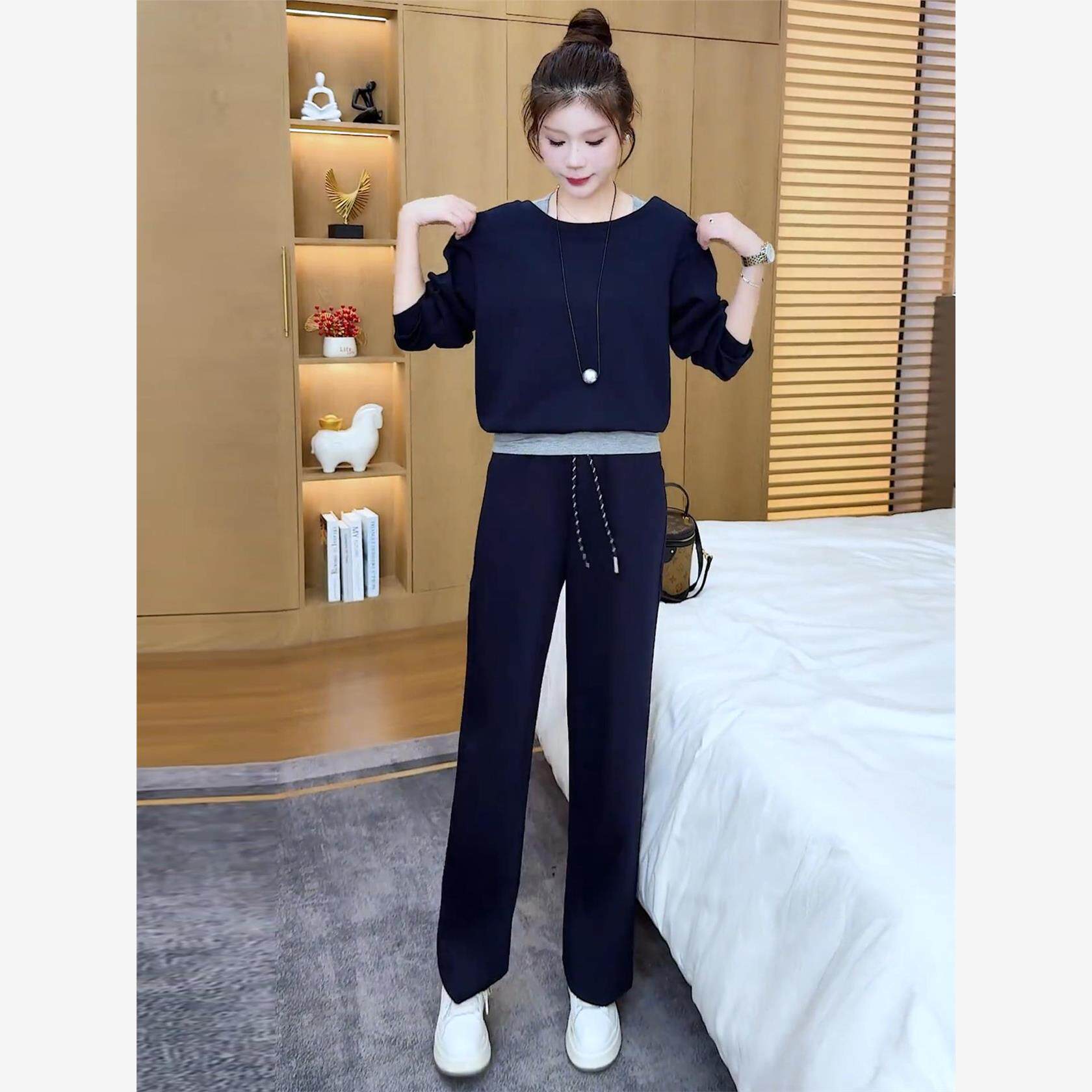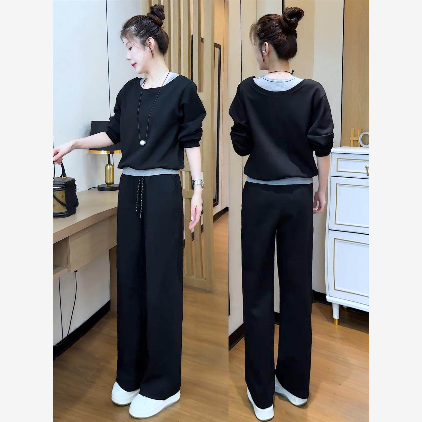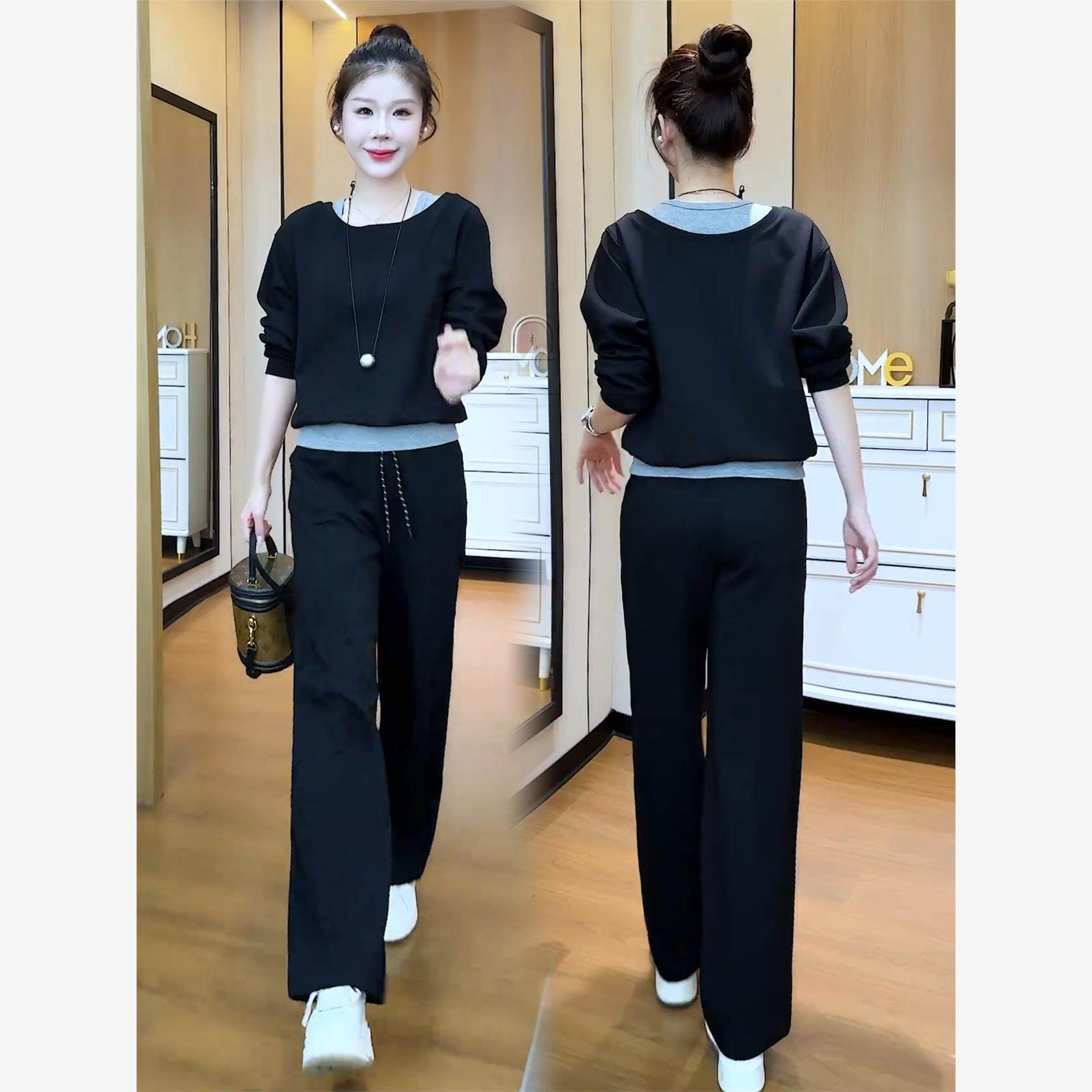 时尚休闲套装女2025秋季新款洋气显瘦假两件长袖卫衣阔腿裤两件套