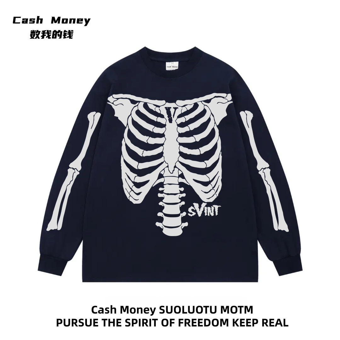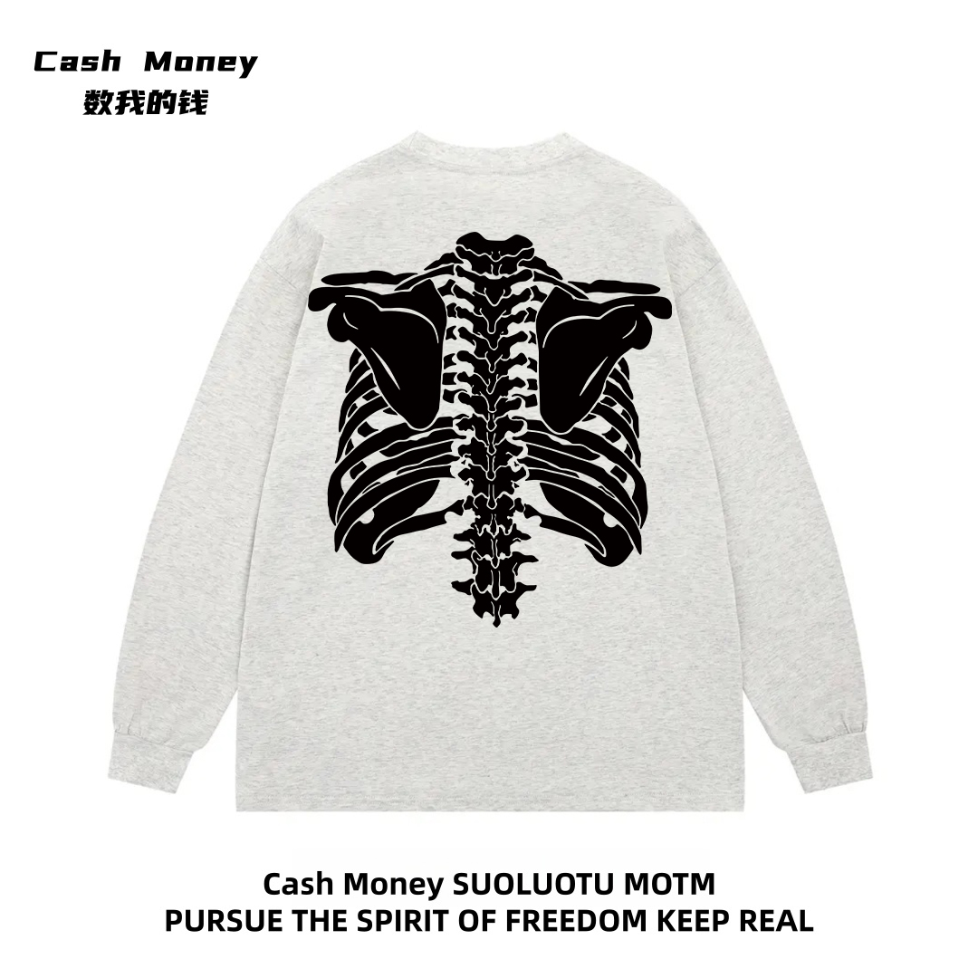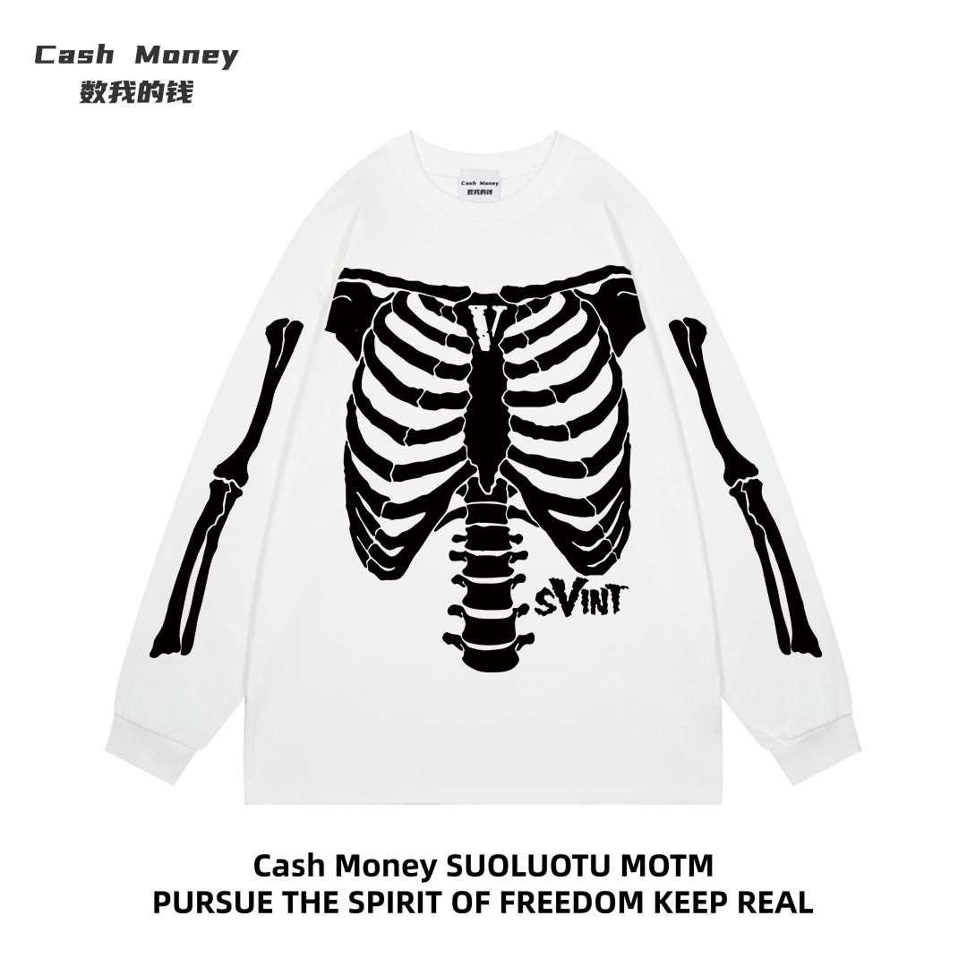 Cash Money数我的钱 美式骷髅印花圆领T恤高街长袖百搭复古打底衫