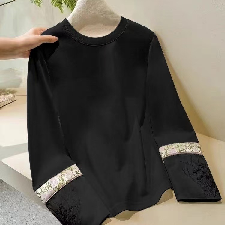 纯棉新中式国风刺绣白色拼接新款袖口春秋2025长袖上衣打底T恤女