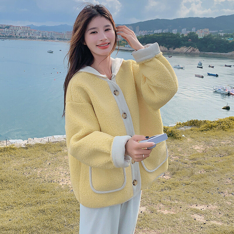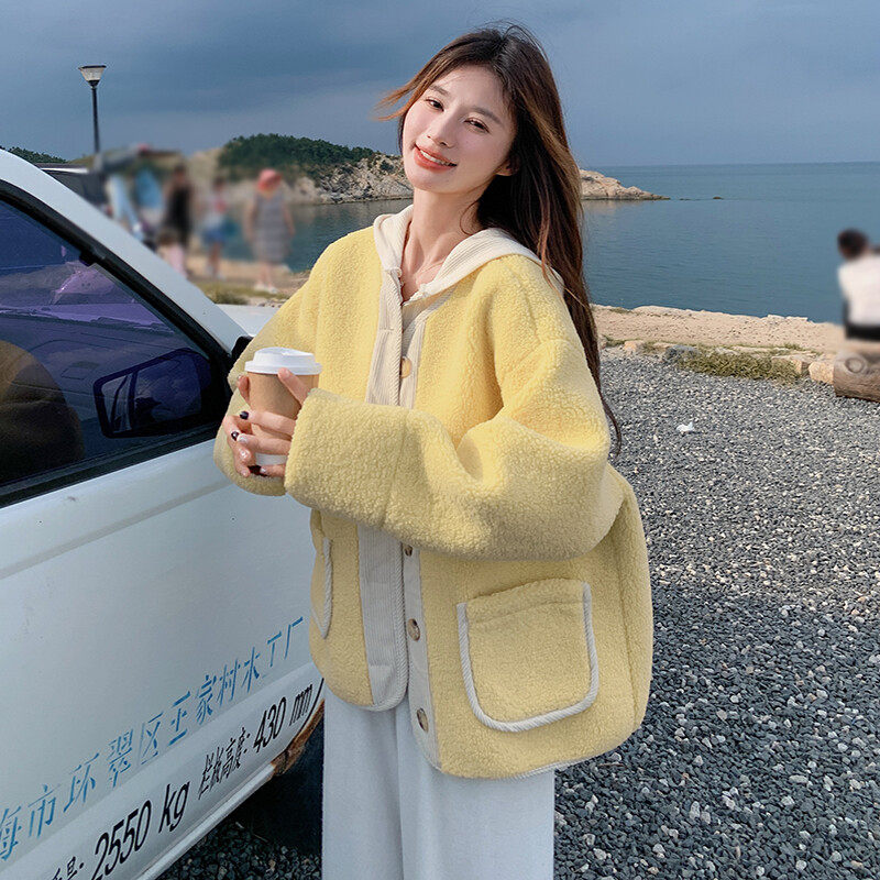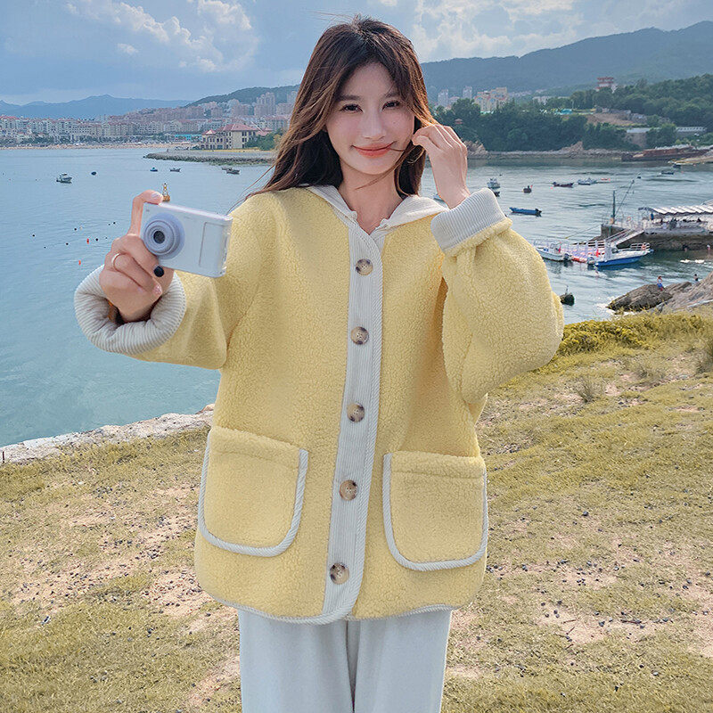 2D078-Y3348-P185K288 拼接圆领黄色短款羊羔毛棉衣