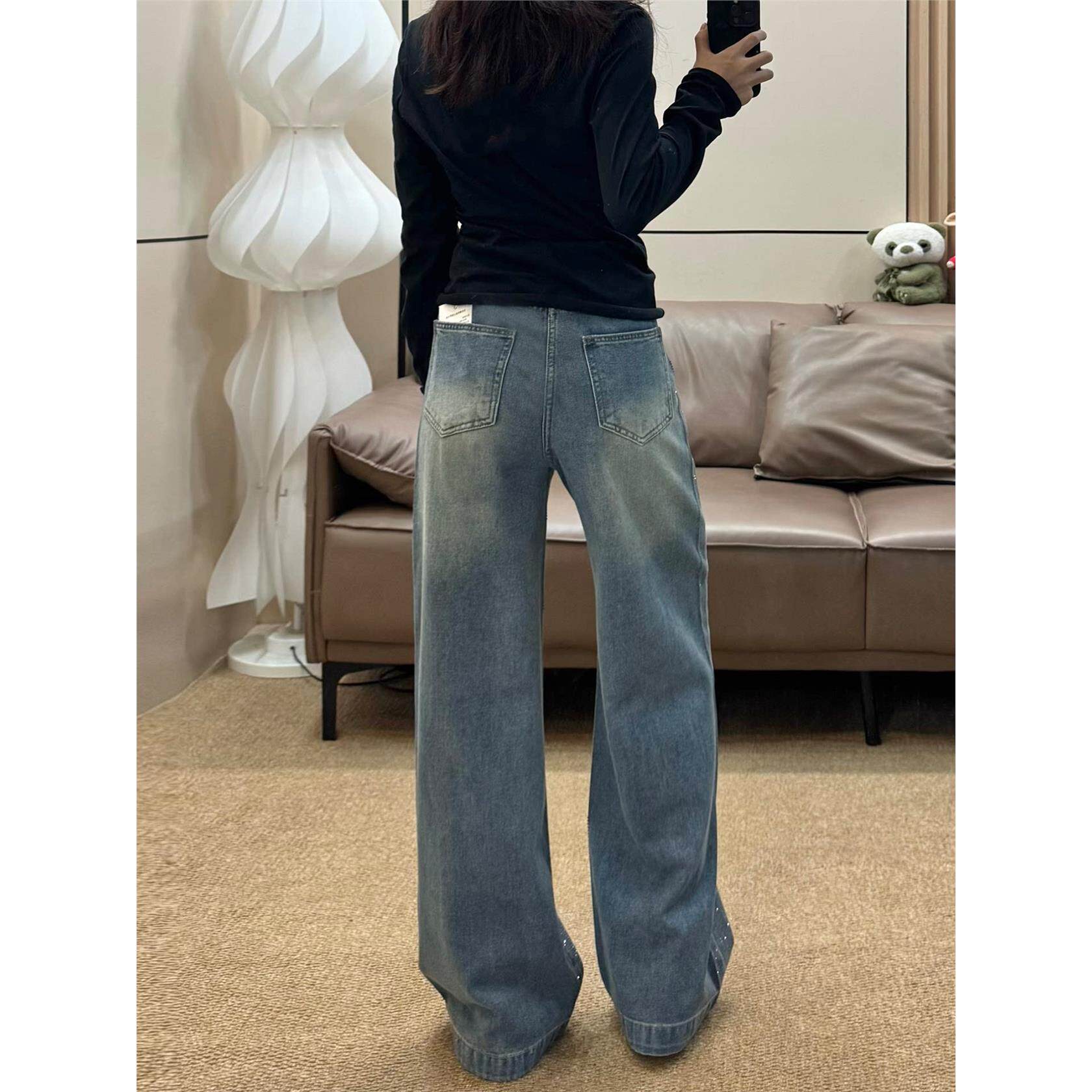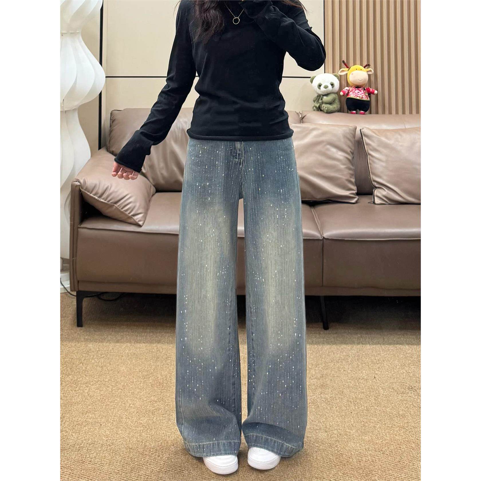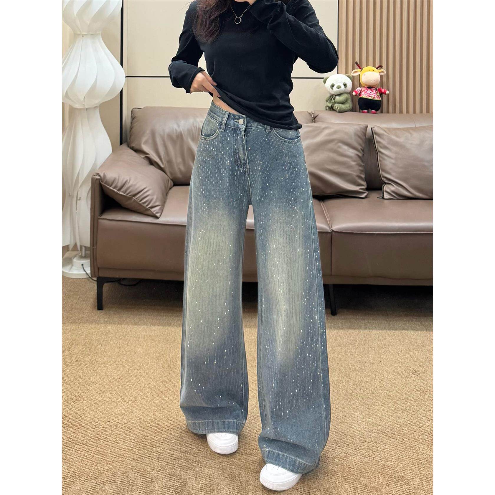 满天星烫钻阔腿牛仔裤女秋季新款大码胖mm高腰宽松显瘦直筒拖地裤