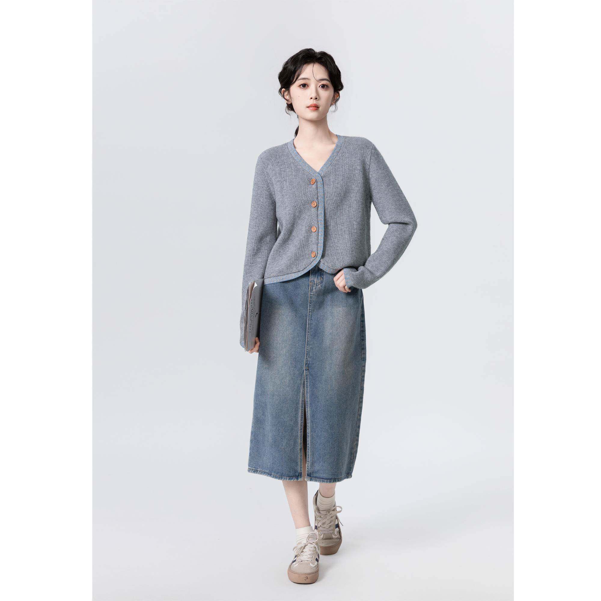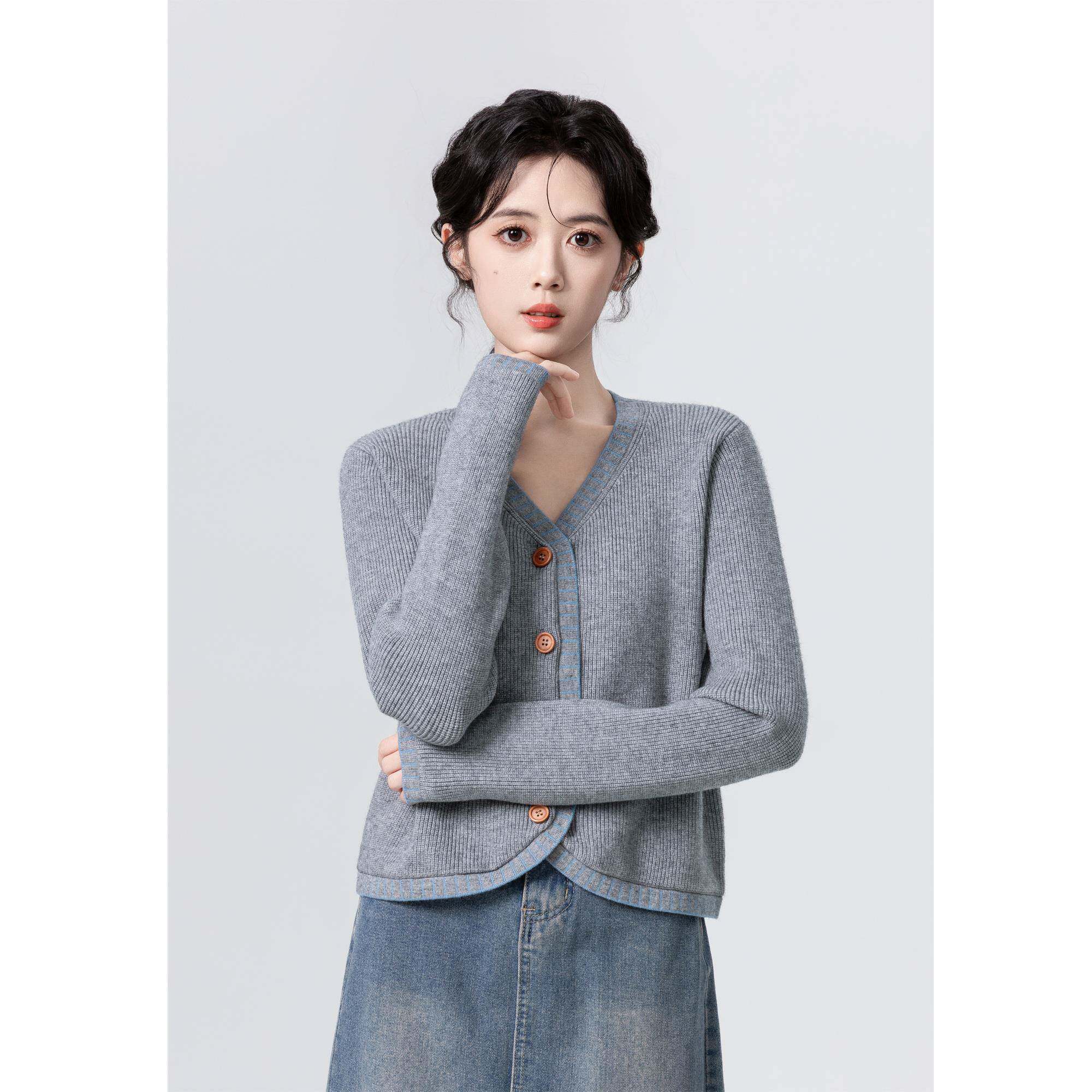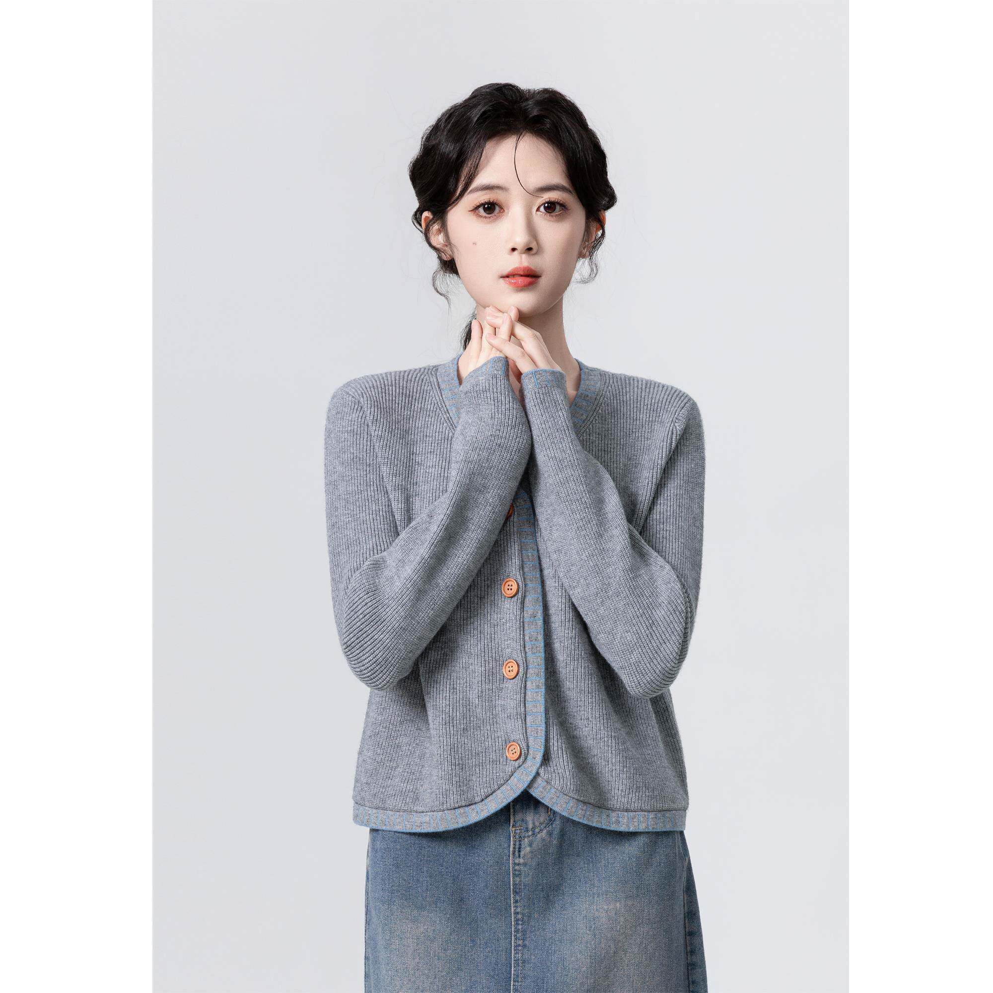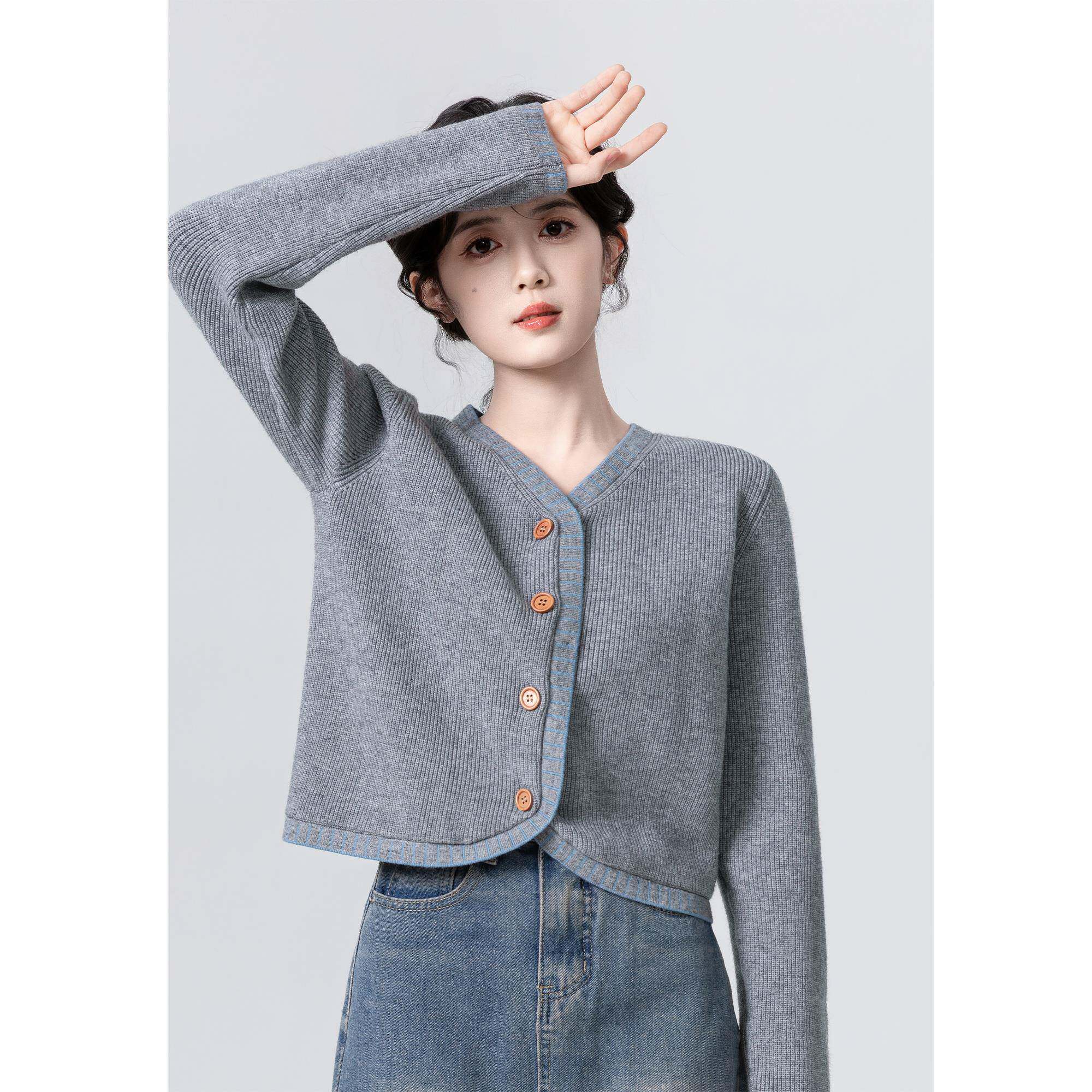 灰色V领针织开衫外套女春秋2025新款复古设计感撞色毛衣短款上衣
