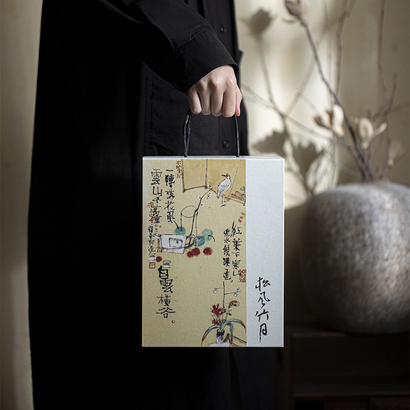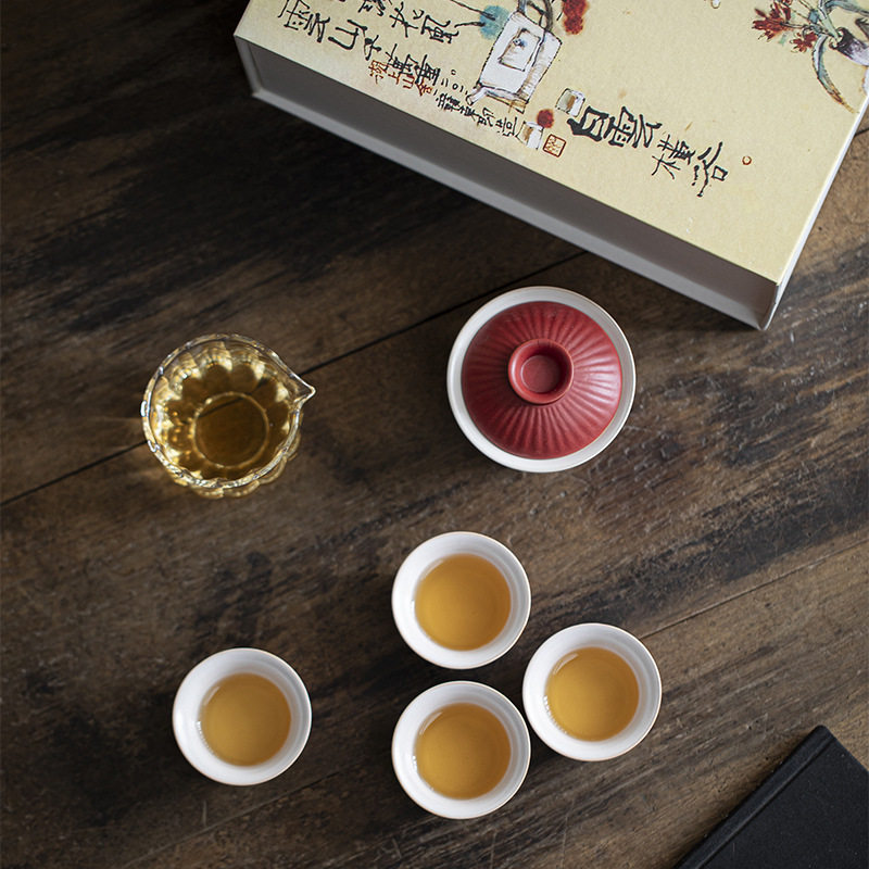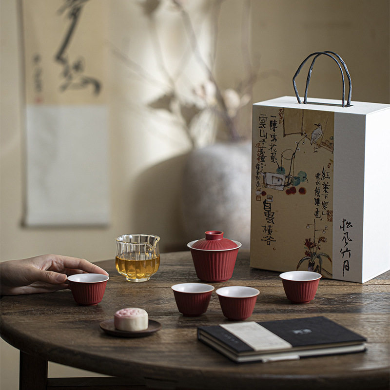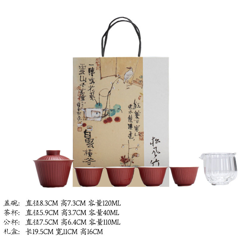 墨己日式粗陶家用茶具套装功夫茶具随手礼珊瑚红清川盖碗四杯套组