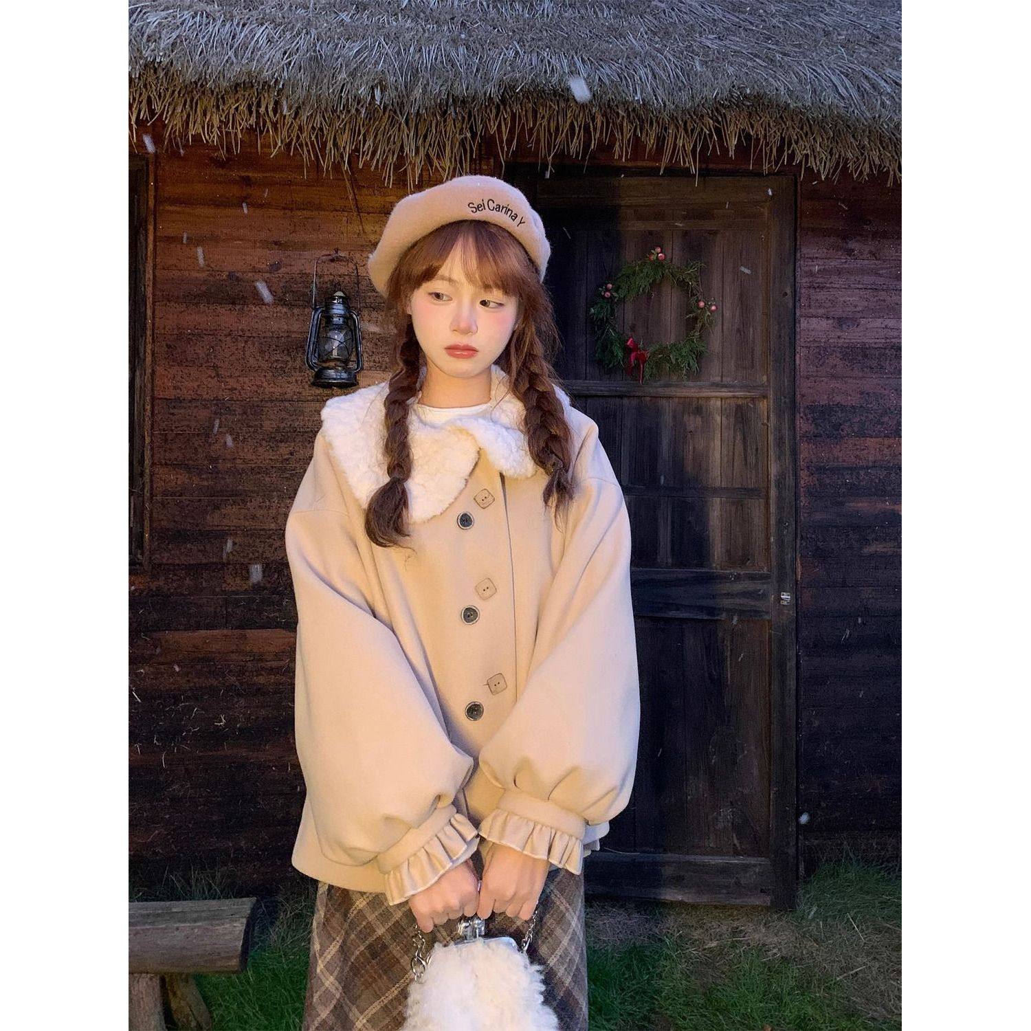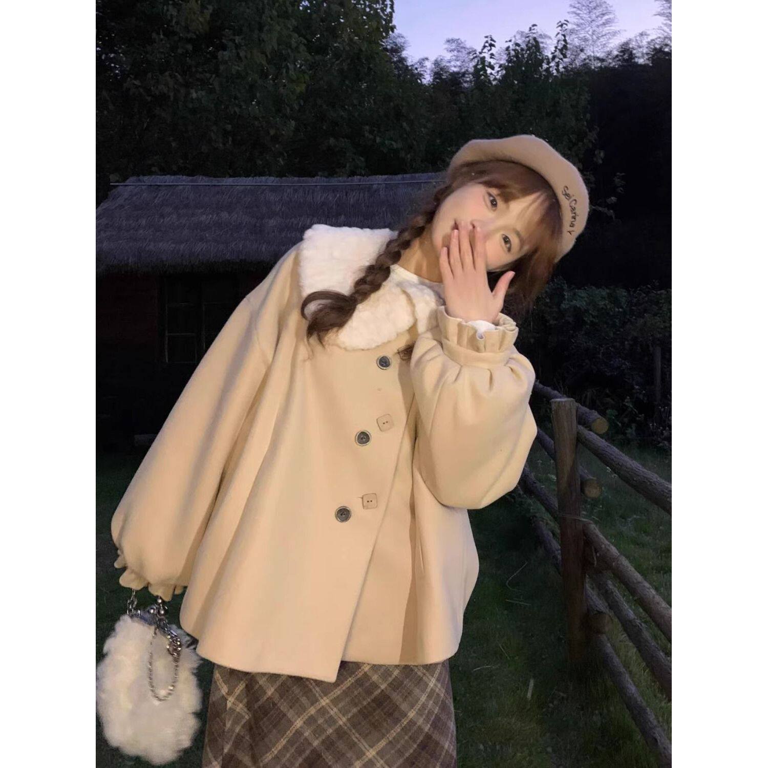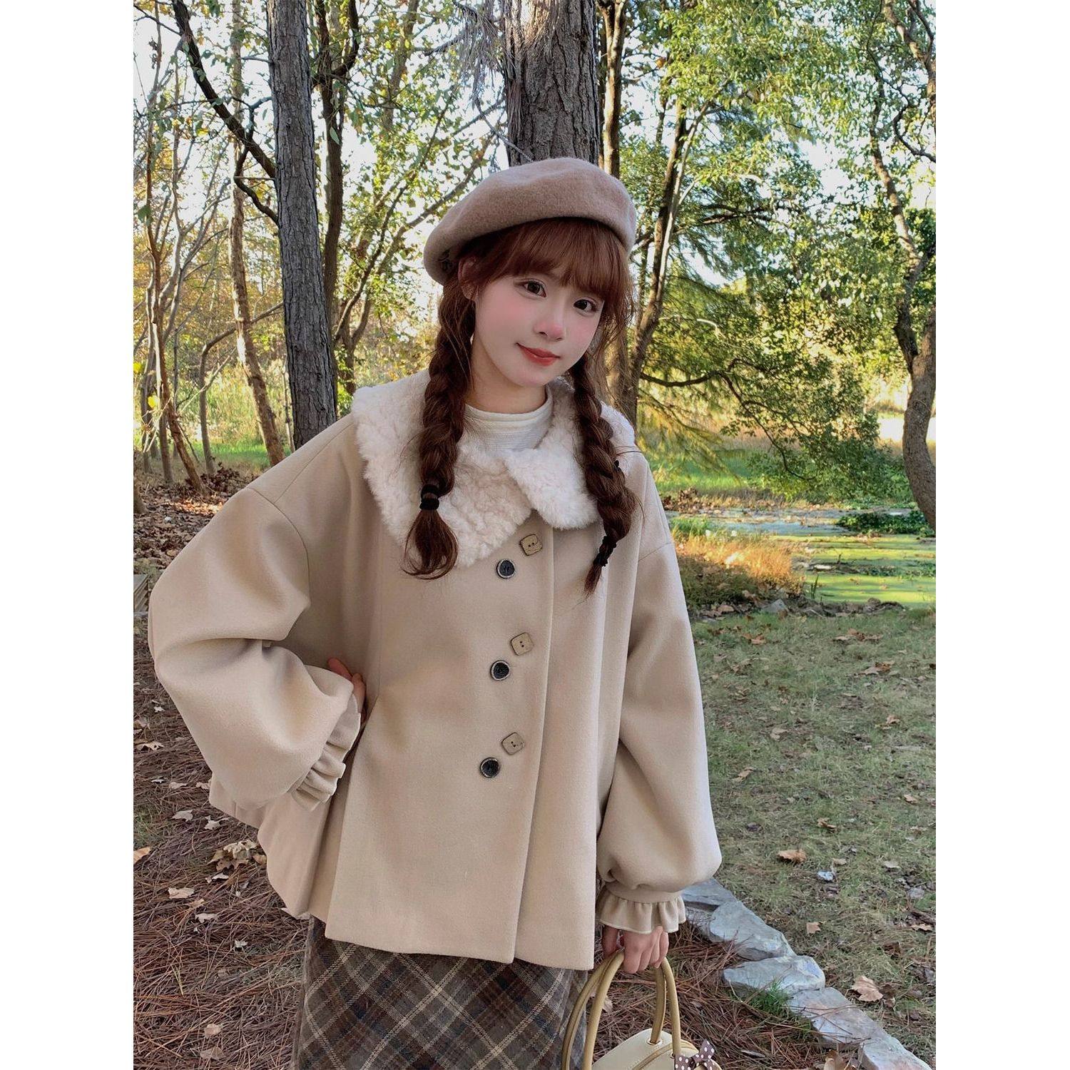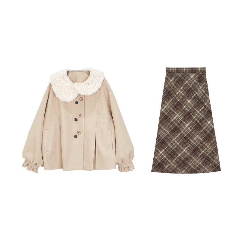 卡布奇诺 卡其色毛呢套装女小个子毛领加厚外套+格纹半裙两件套
