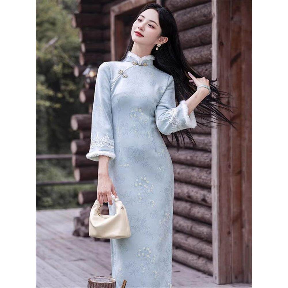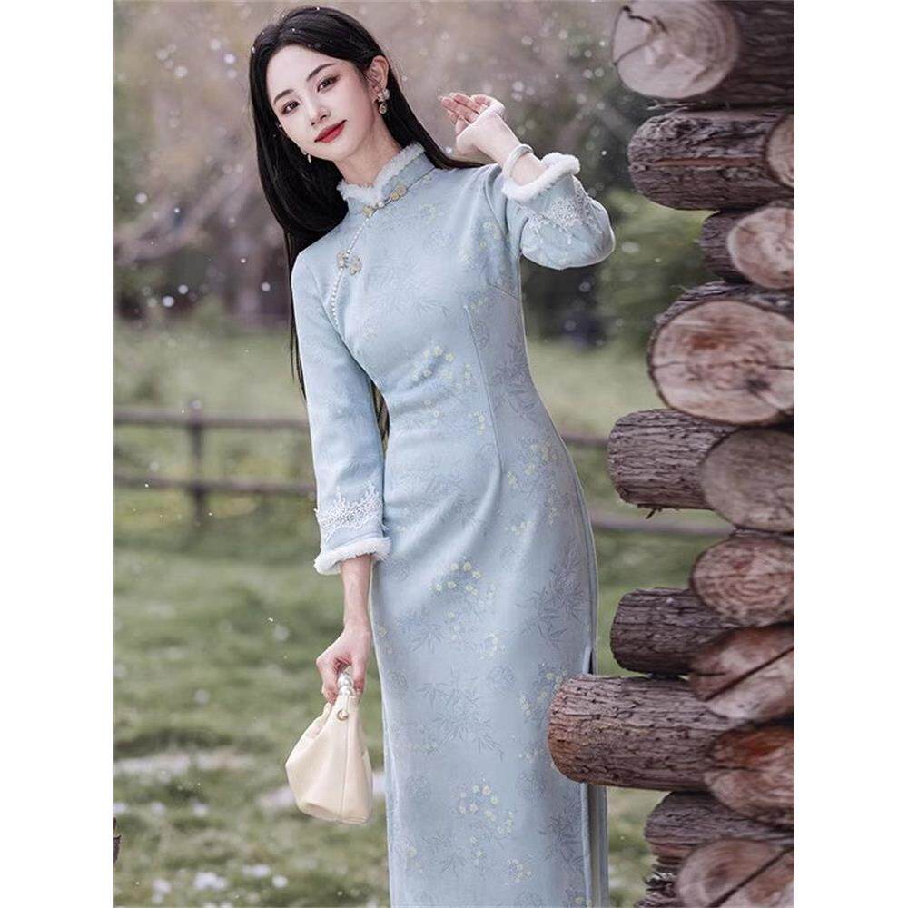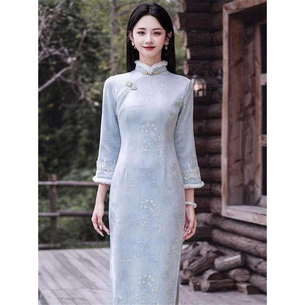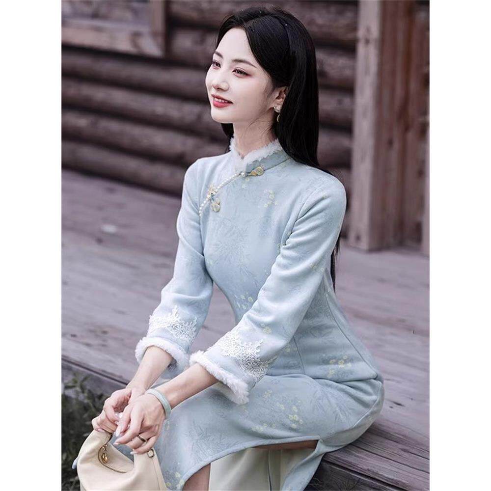 首页> 女装> 气质蓝色旗袍冬季加绒2025素雅新款中式保暖淑女国风气质连衣裙