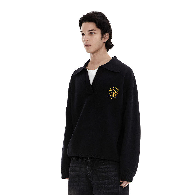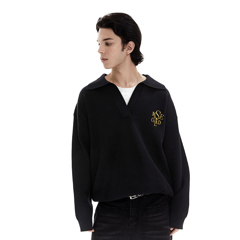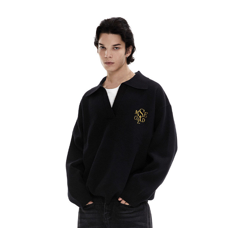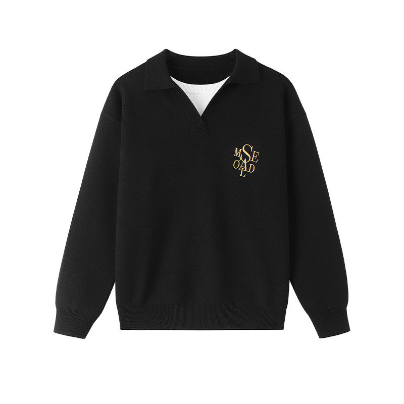 SAME OLD男女同款重磅假两件V领衫刺绣针织宽松休闲翻领毛衣套头