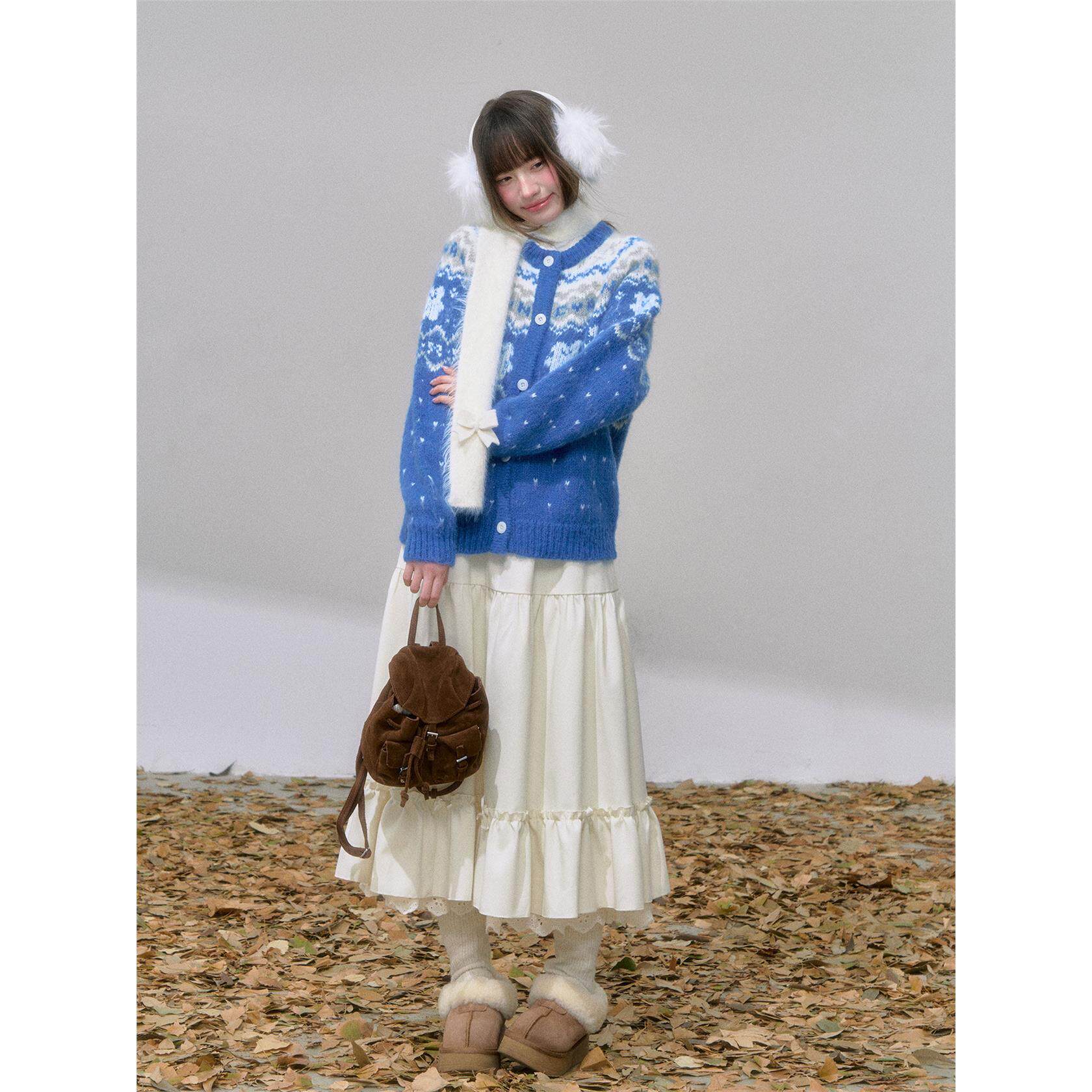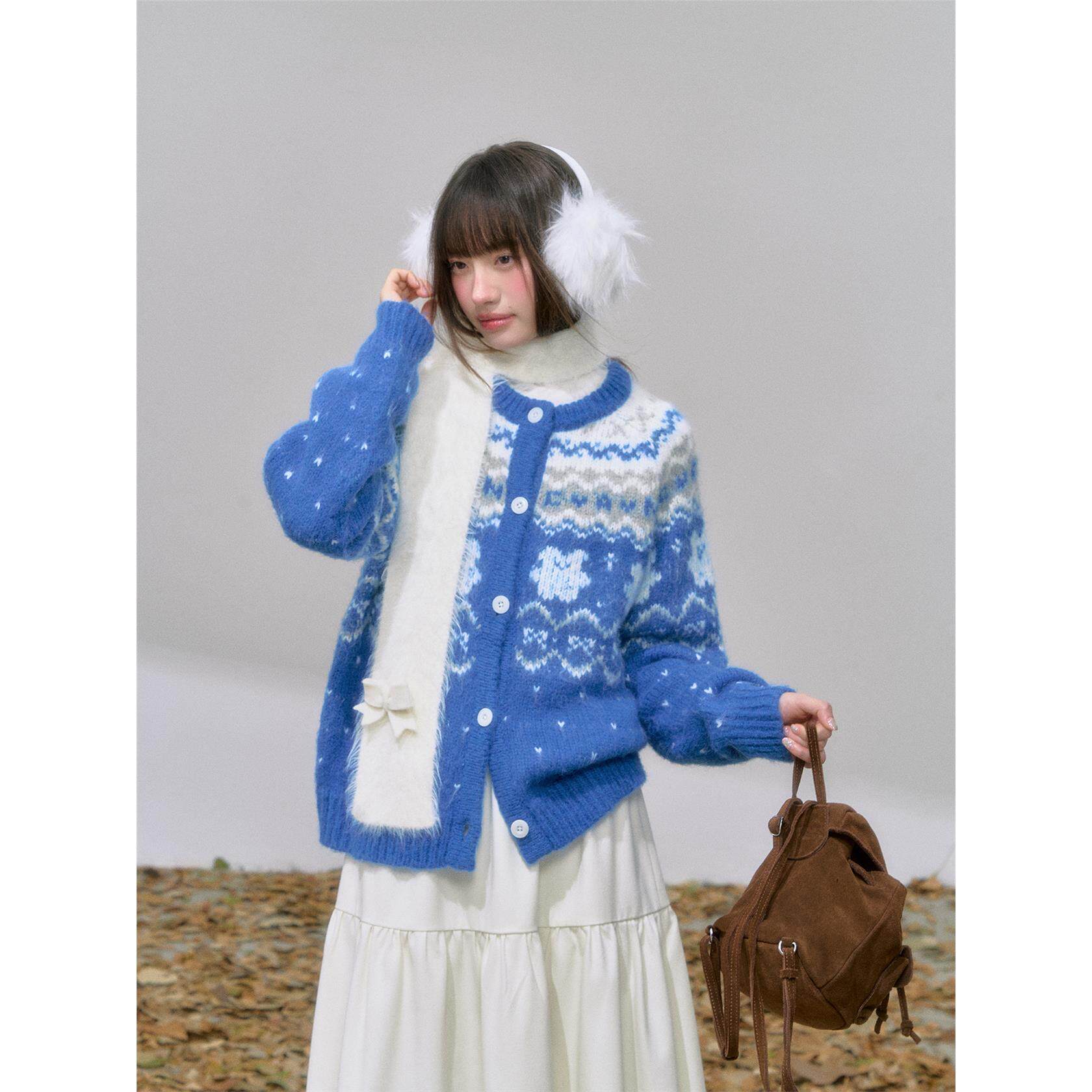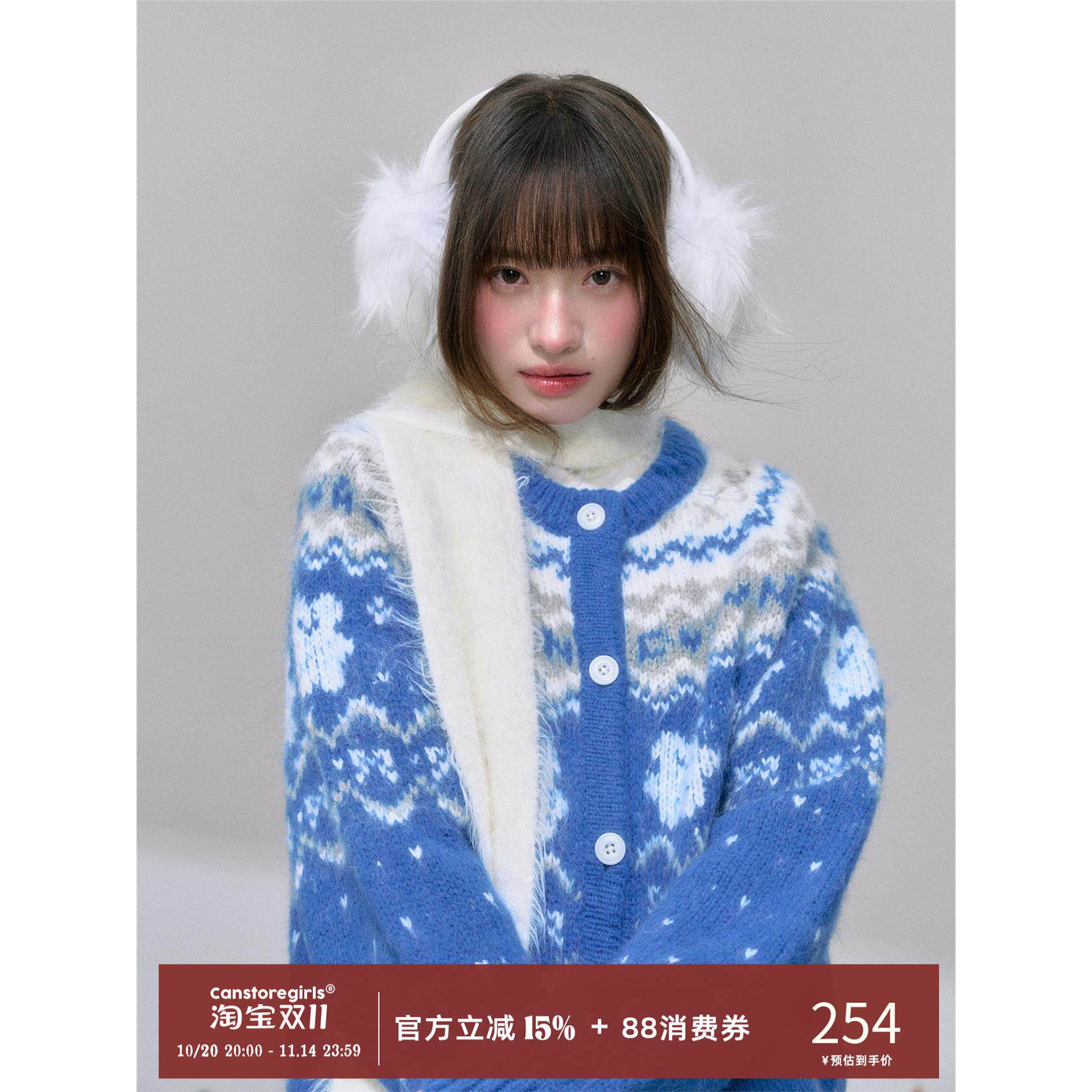罐头士多所 '屿蓝织梦'宝蓝色针织衫女冬季撞色费尔岛插肩袖毛衣