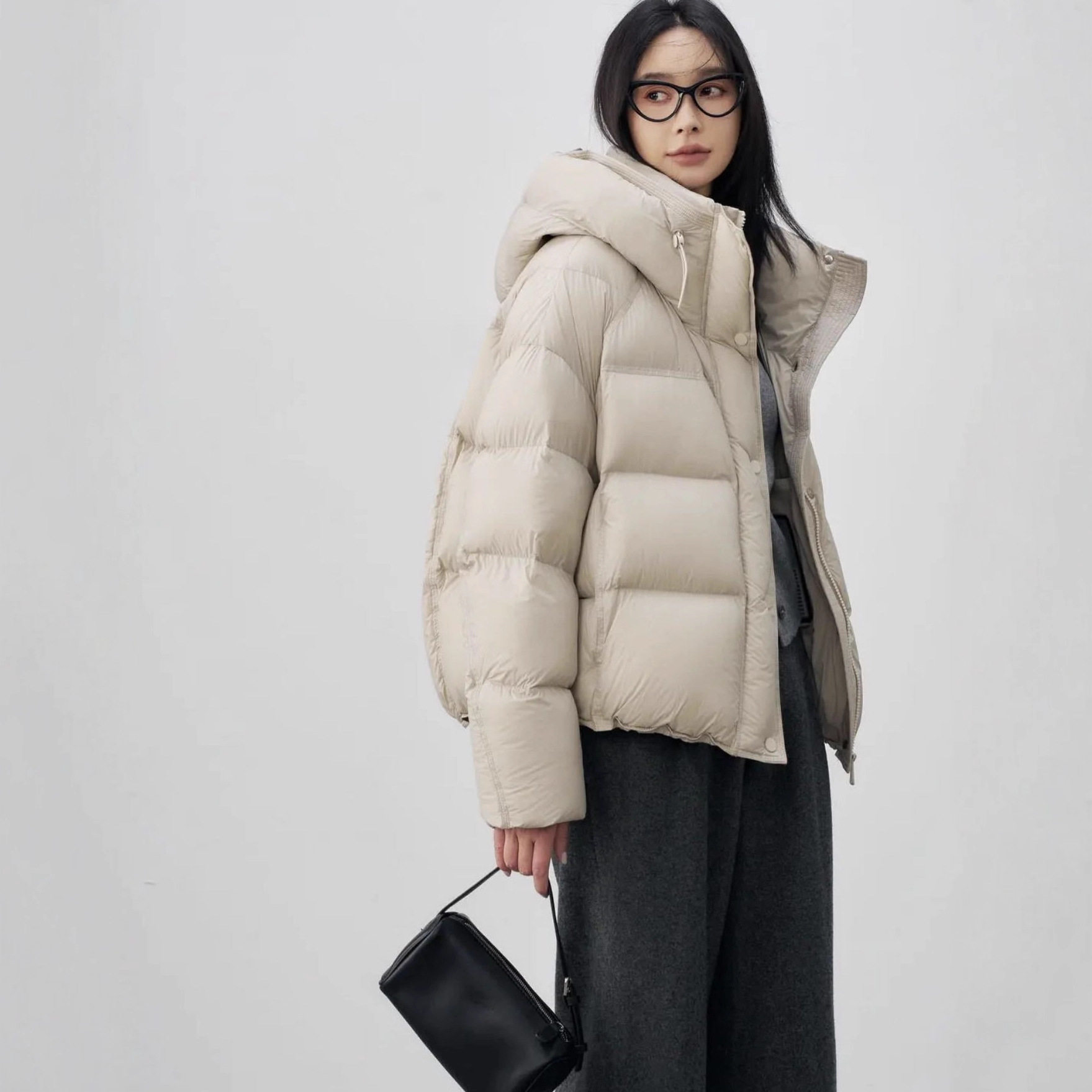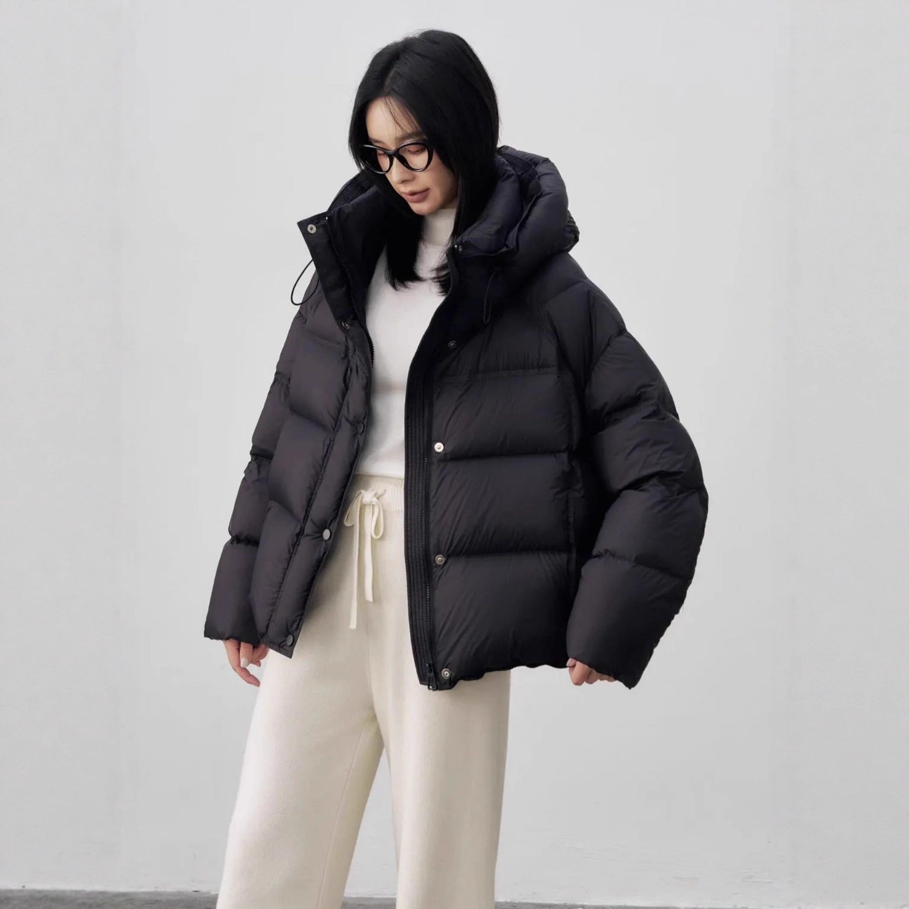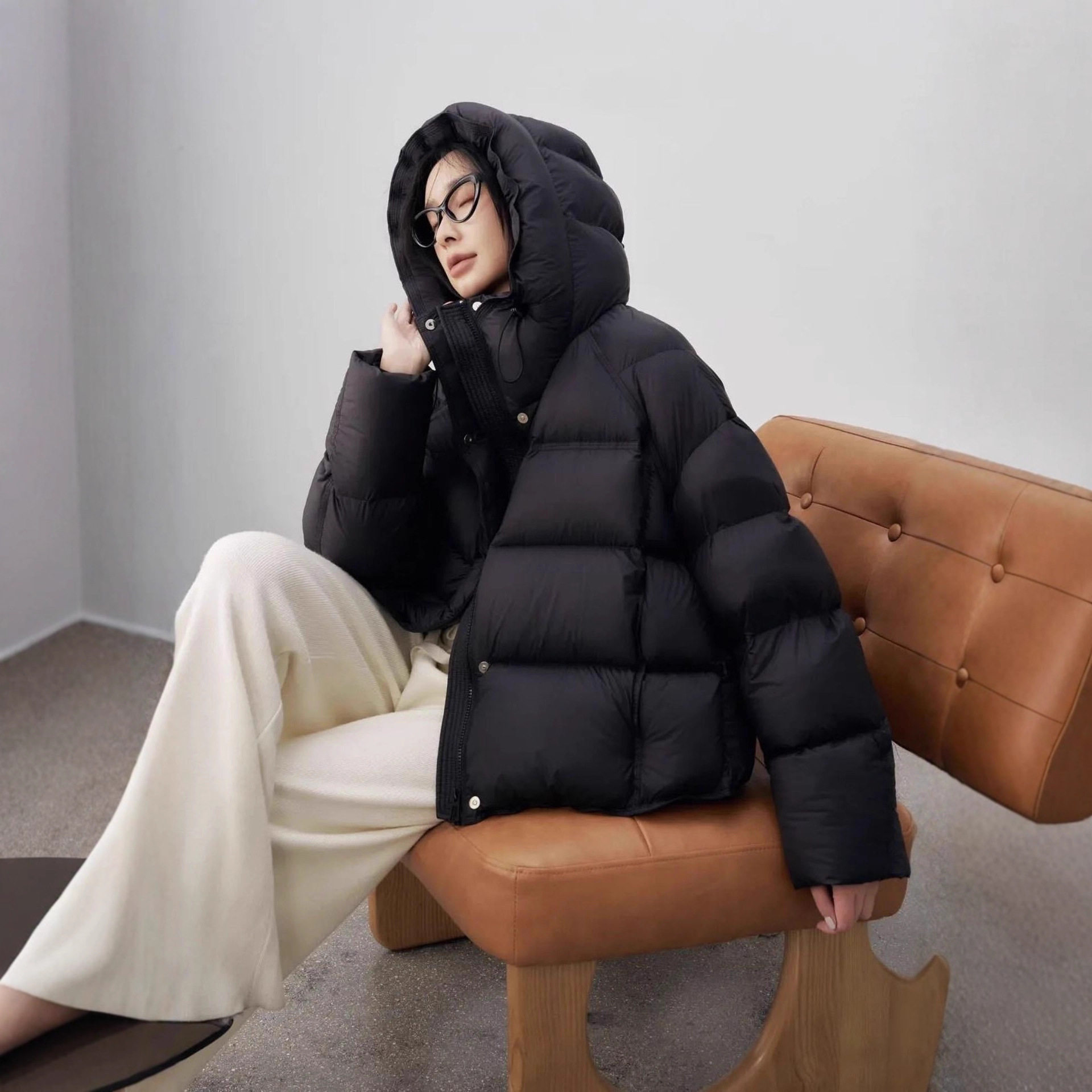 90白鹅绒连帽羽绒服女2025年冬季时尚宽松泡芙感面包服