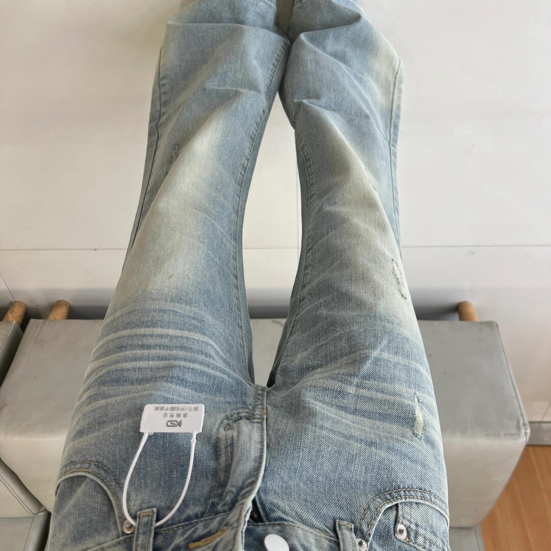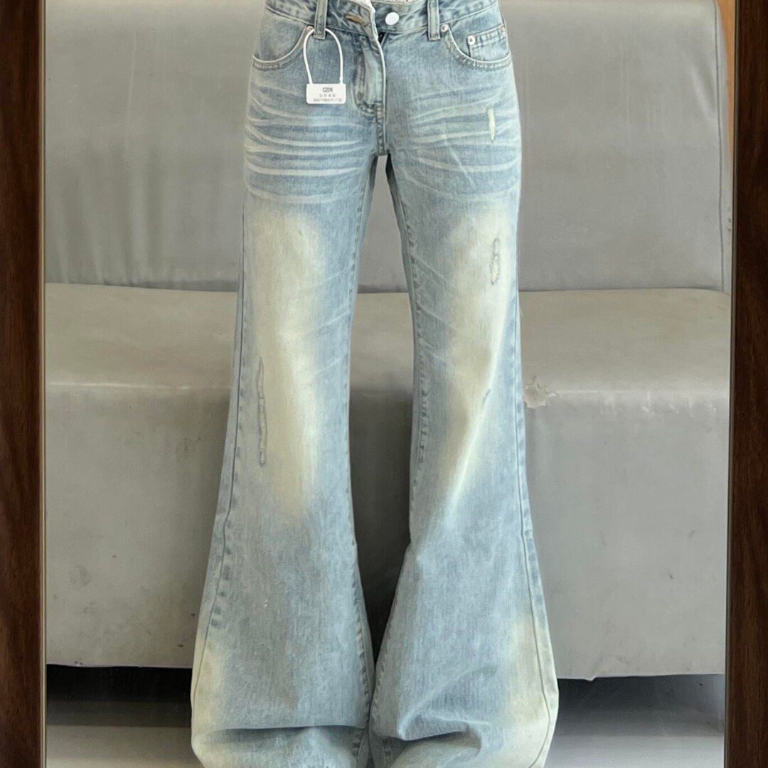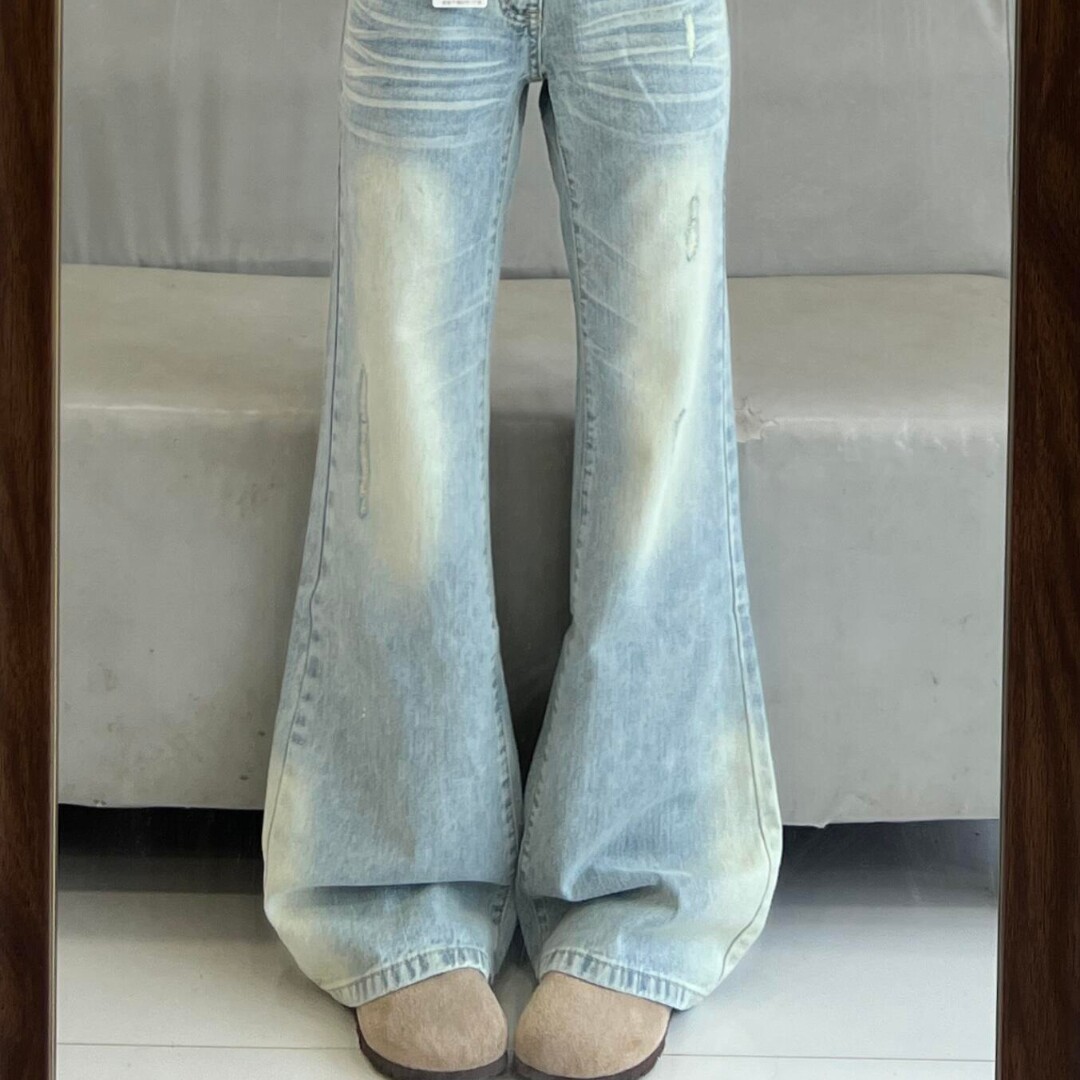 小个子蕾丝拼接不贴腿微喇牛仔裤女低腰显瘦浅色拖地马蹄裤