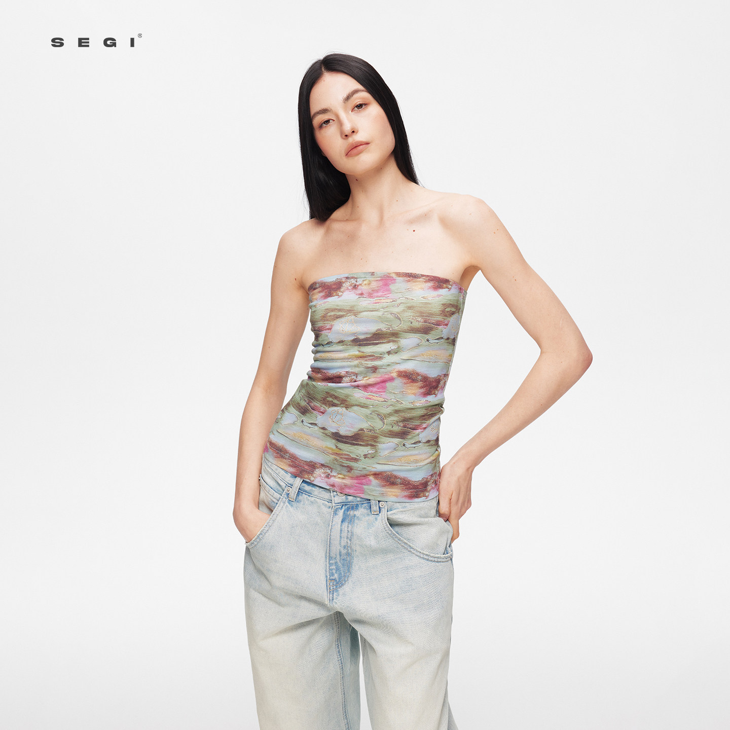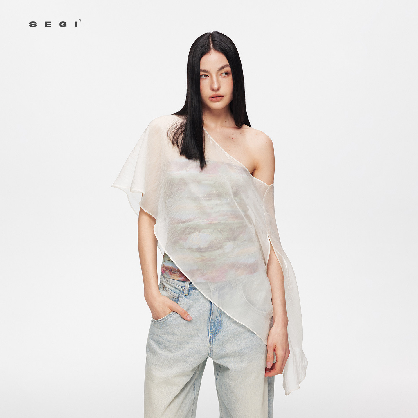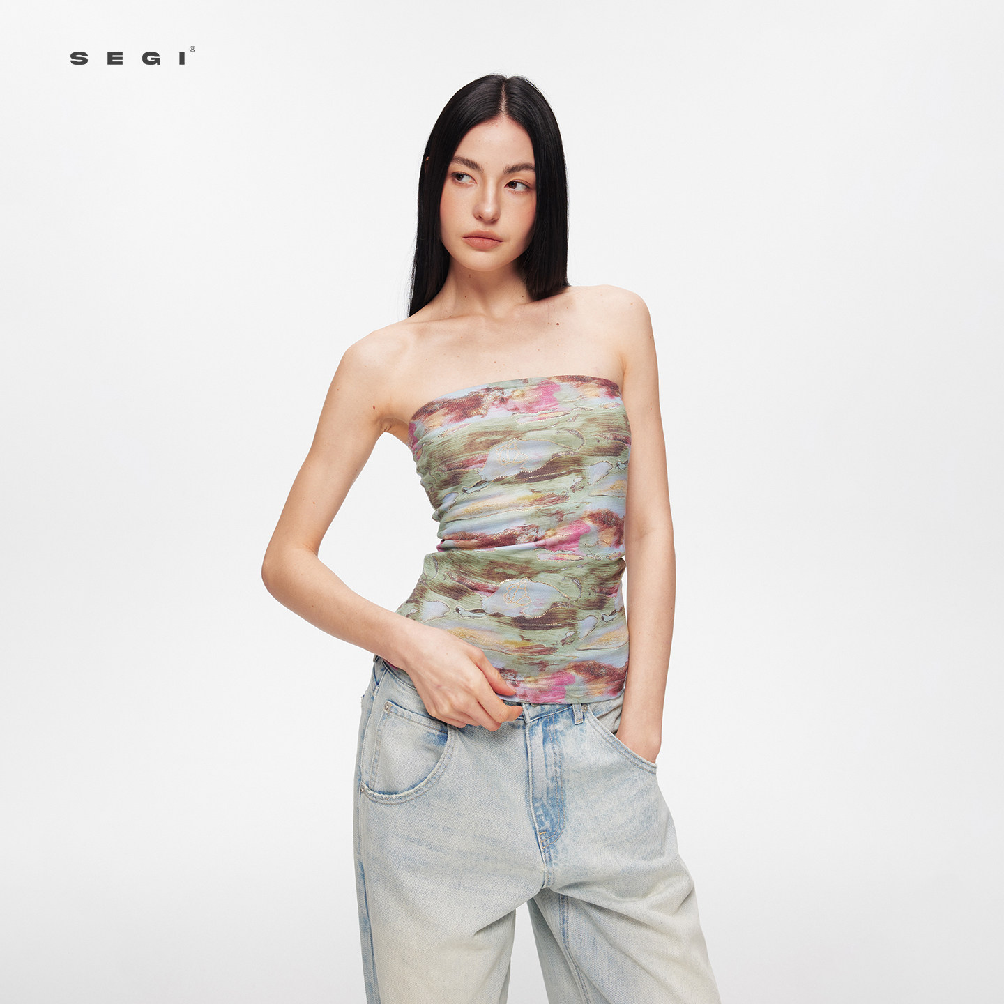 SEGI 天丝羊毛睡莲油画抹胸+多穿细闪不对称披风套装女百搭上衣
