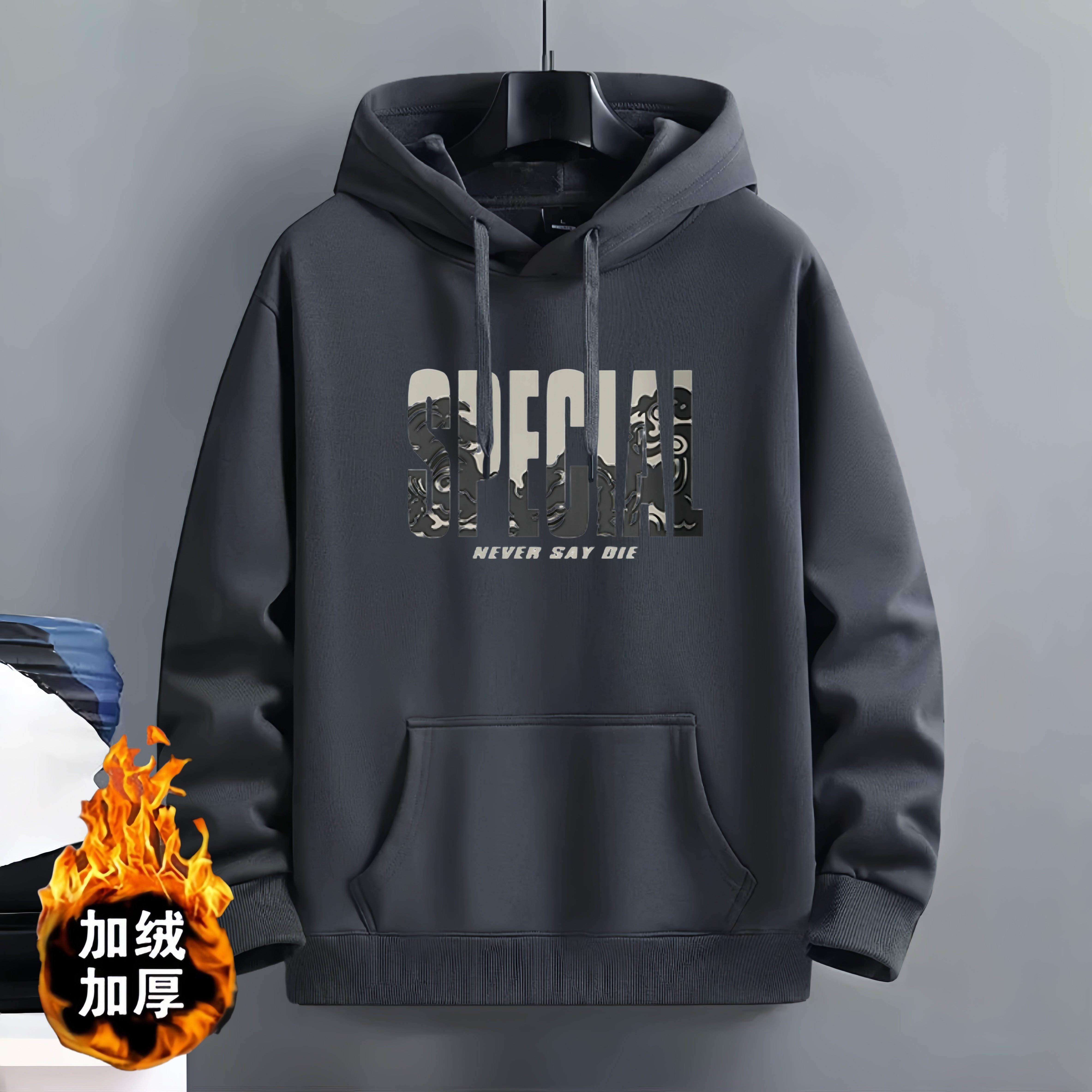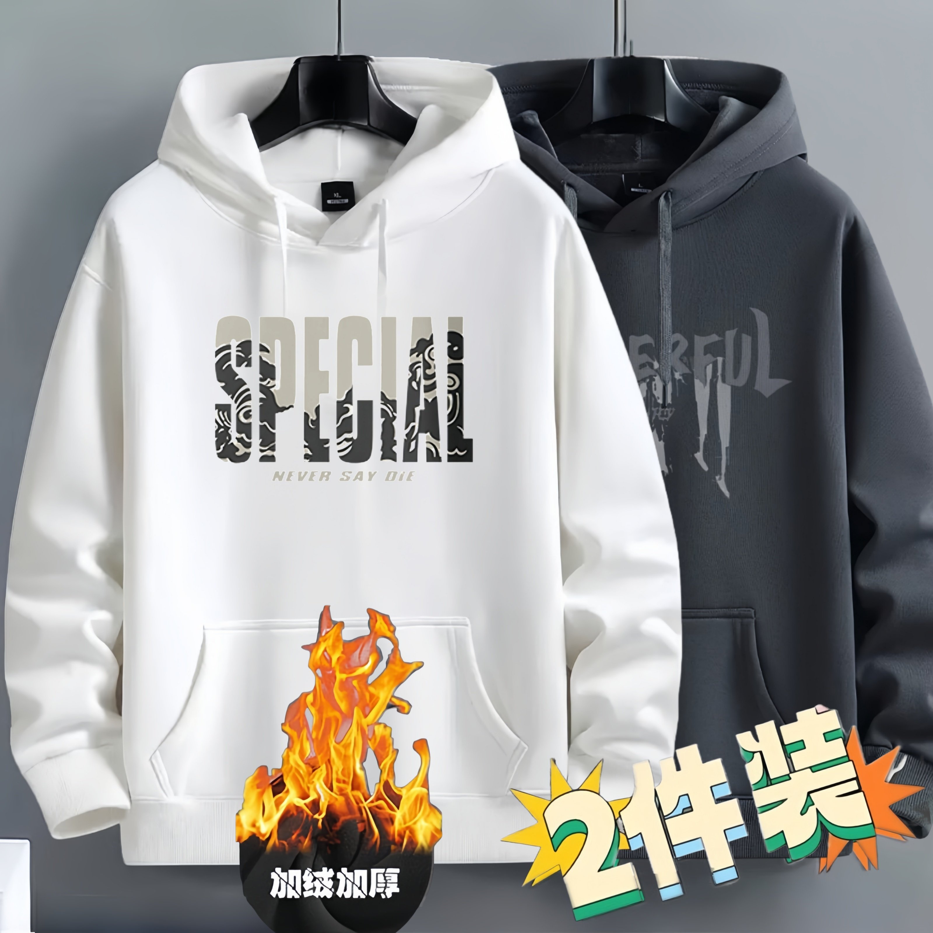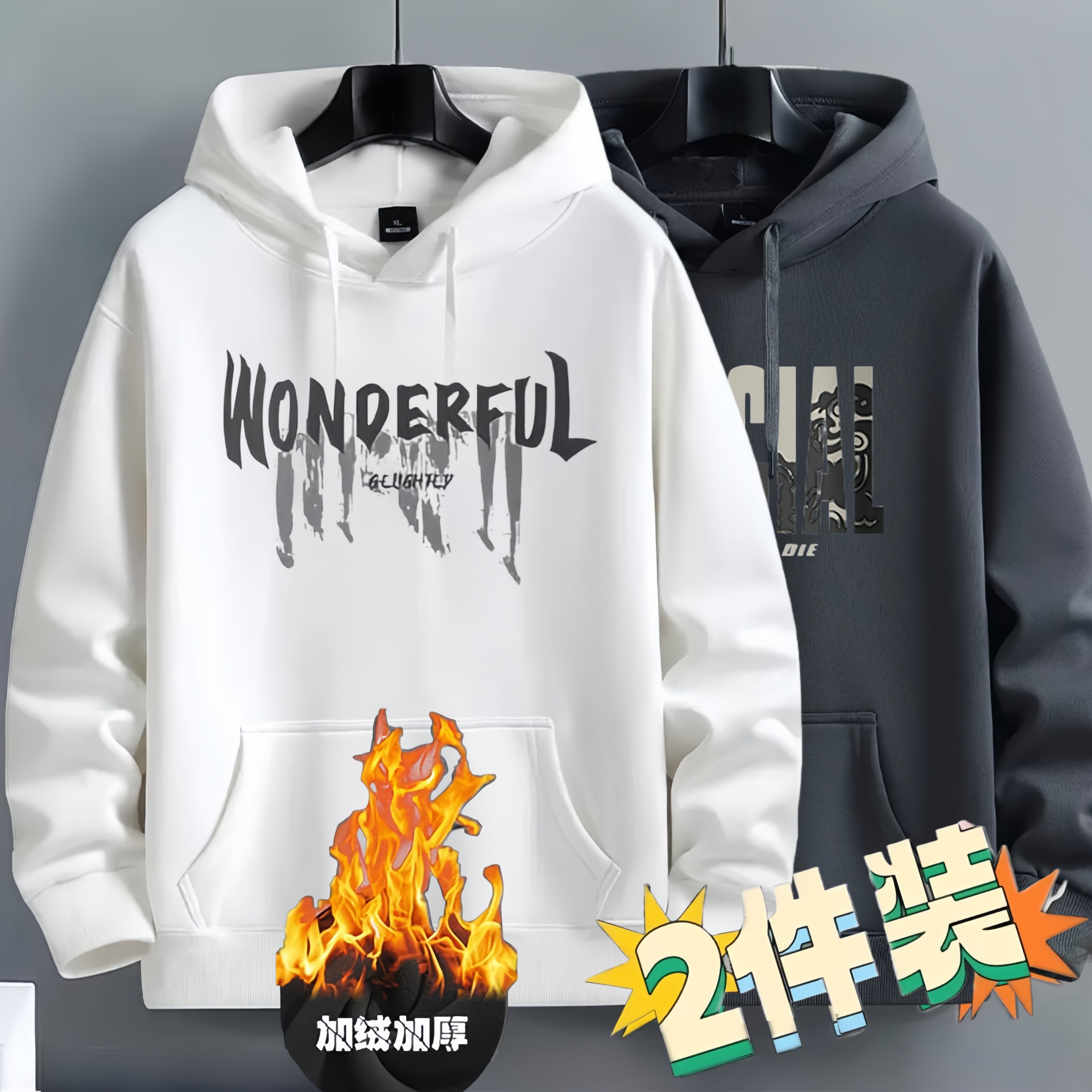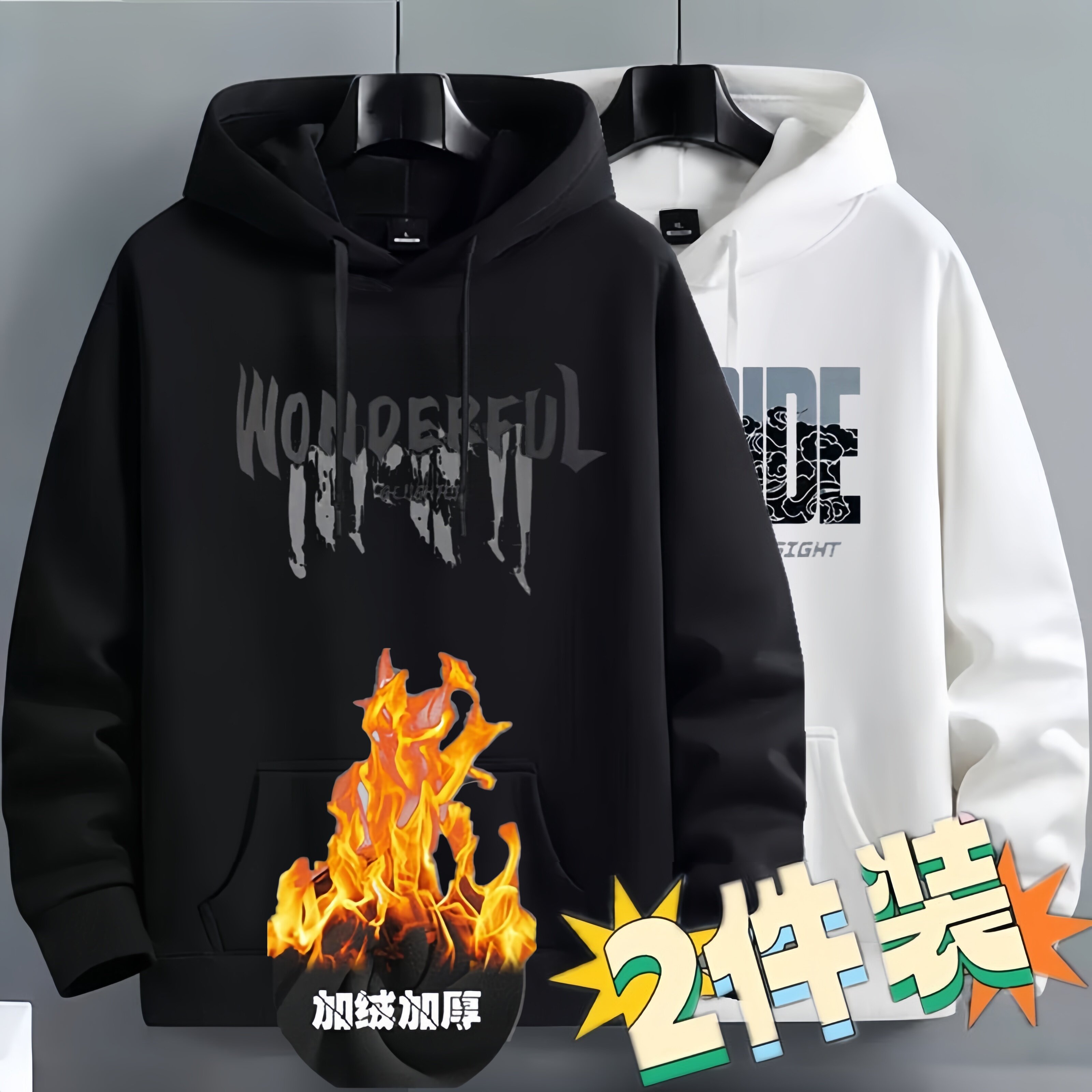 加绒加厚秋冬季连帽卫衣男帽衫潮牌美式休闲宽松学生上衣服薄外套