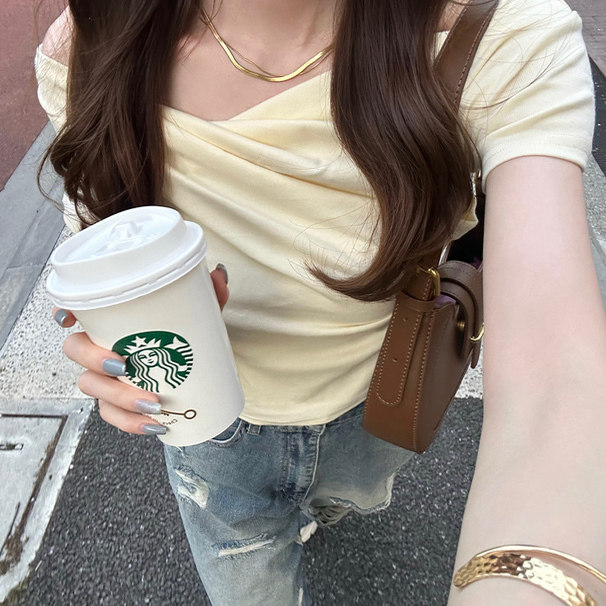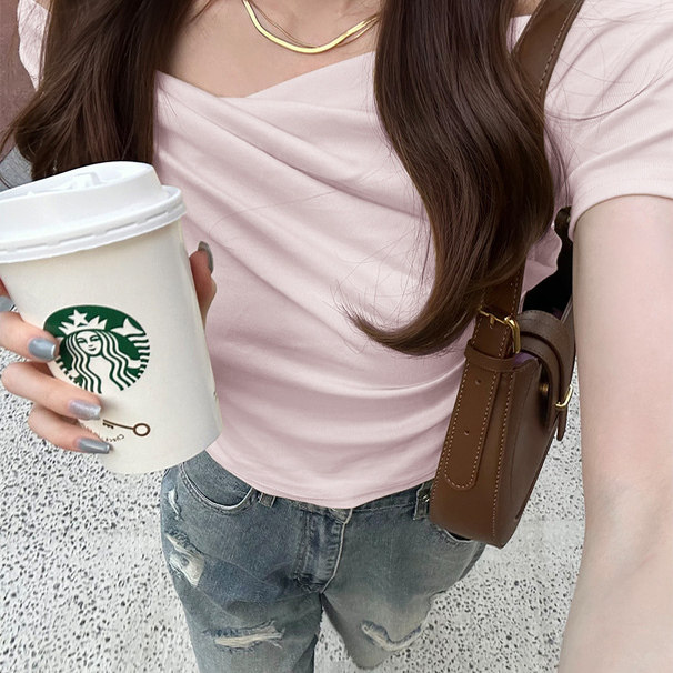 D090114日单新款GL褶皱领套头修身显瘦女纯色甜美气质短款棉质T恤