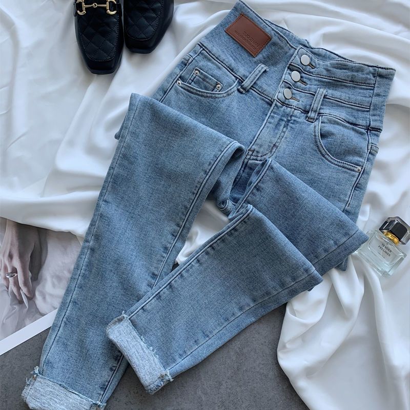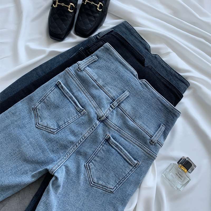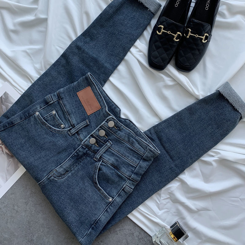 复古百搭超高腰三排扣小脚牛仔裤女2024夏季新款修身显瘦铅笔裤潮