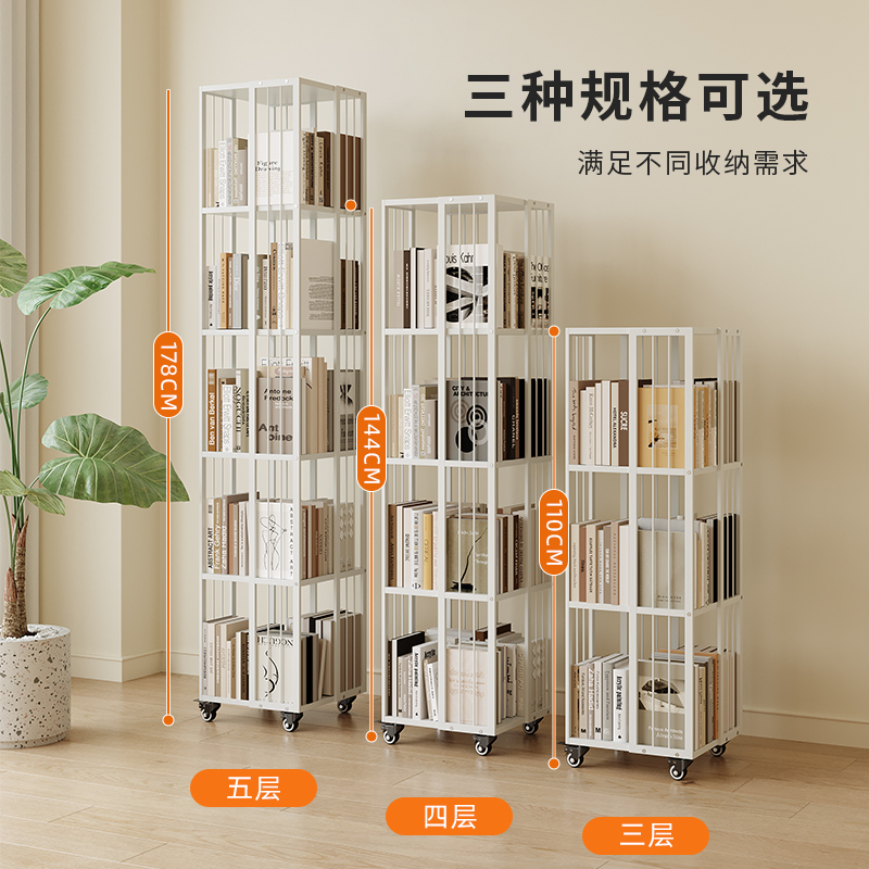 旋转书架360度书柜收纳客厅书桌落地多层可移动铁艺置物架带轮子