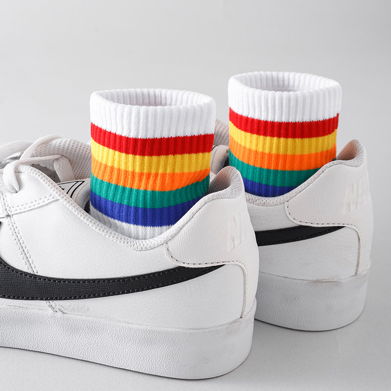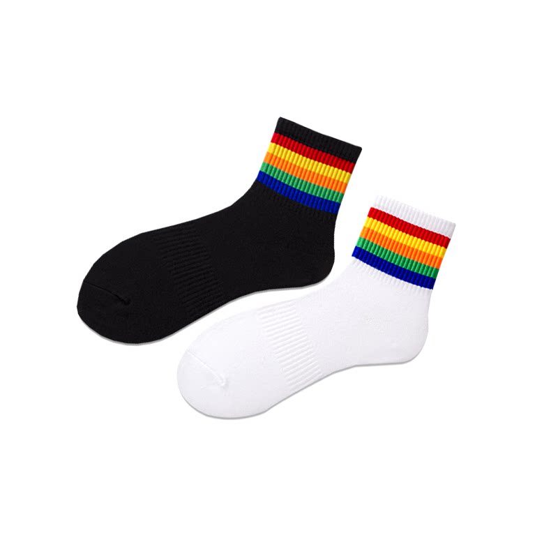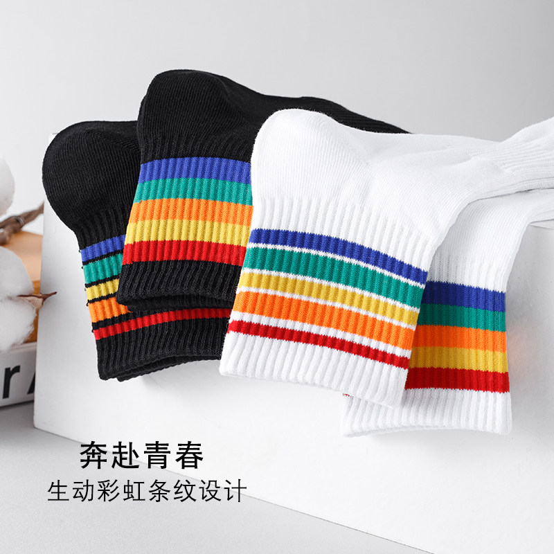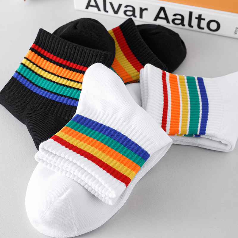 4双彩虹袜子男中筒袜秋冬加厚纯棉条纹ins潮流学院风运动男长袜女