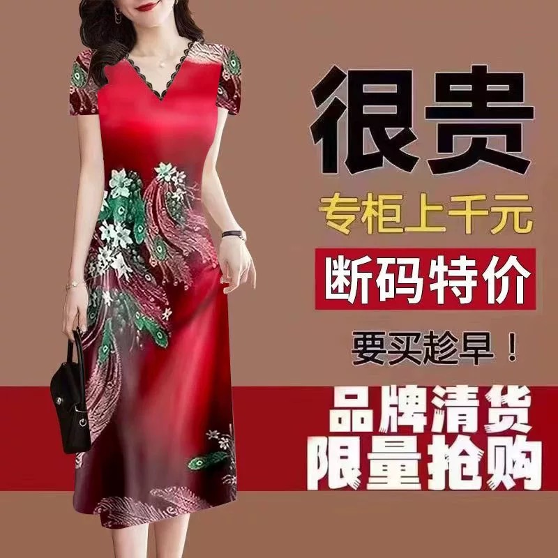 清仓捡漏~断码中年民族风蕾丝女装夏季新款洋气印花v领修身连衣裙