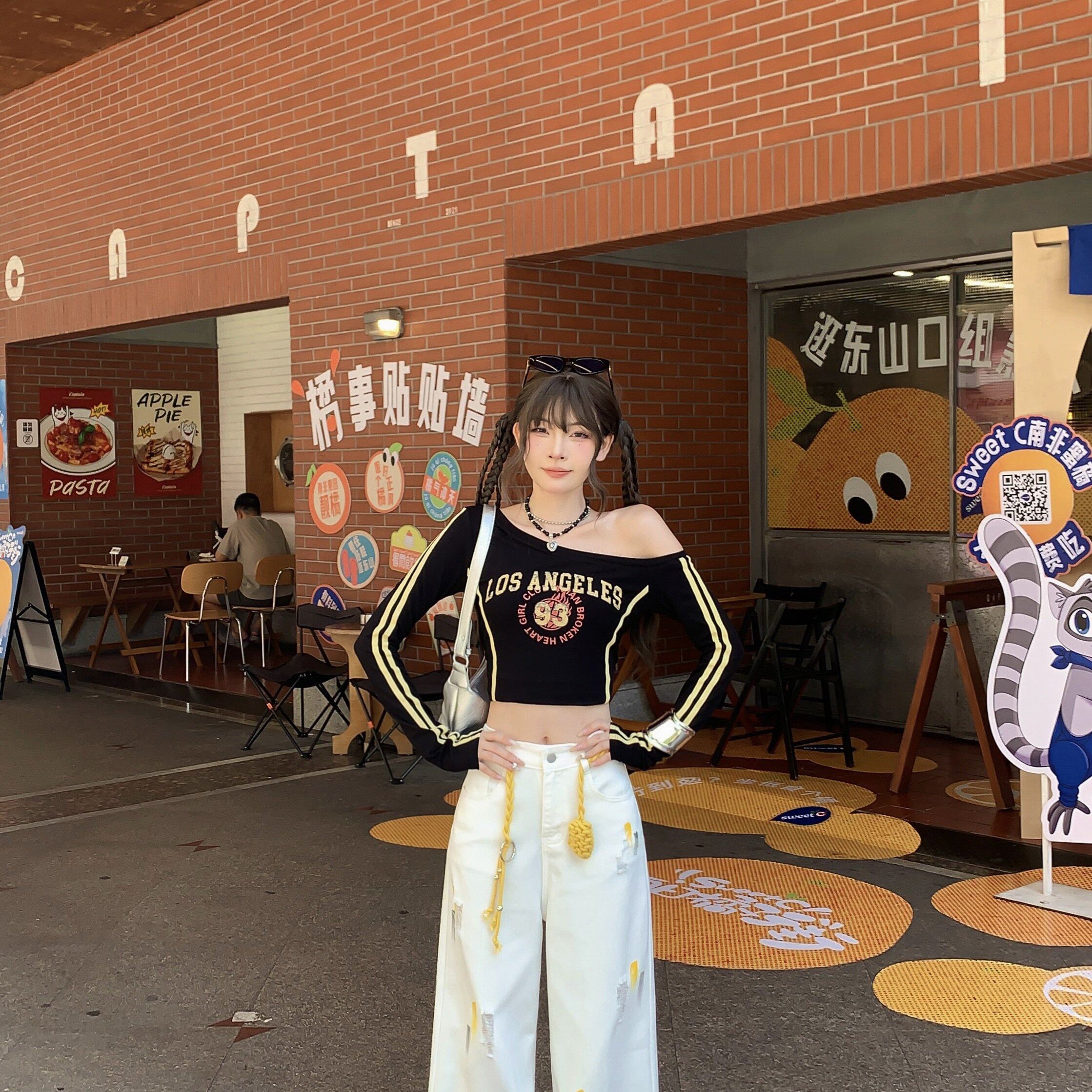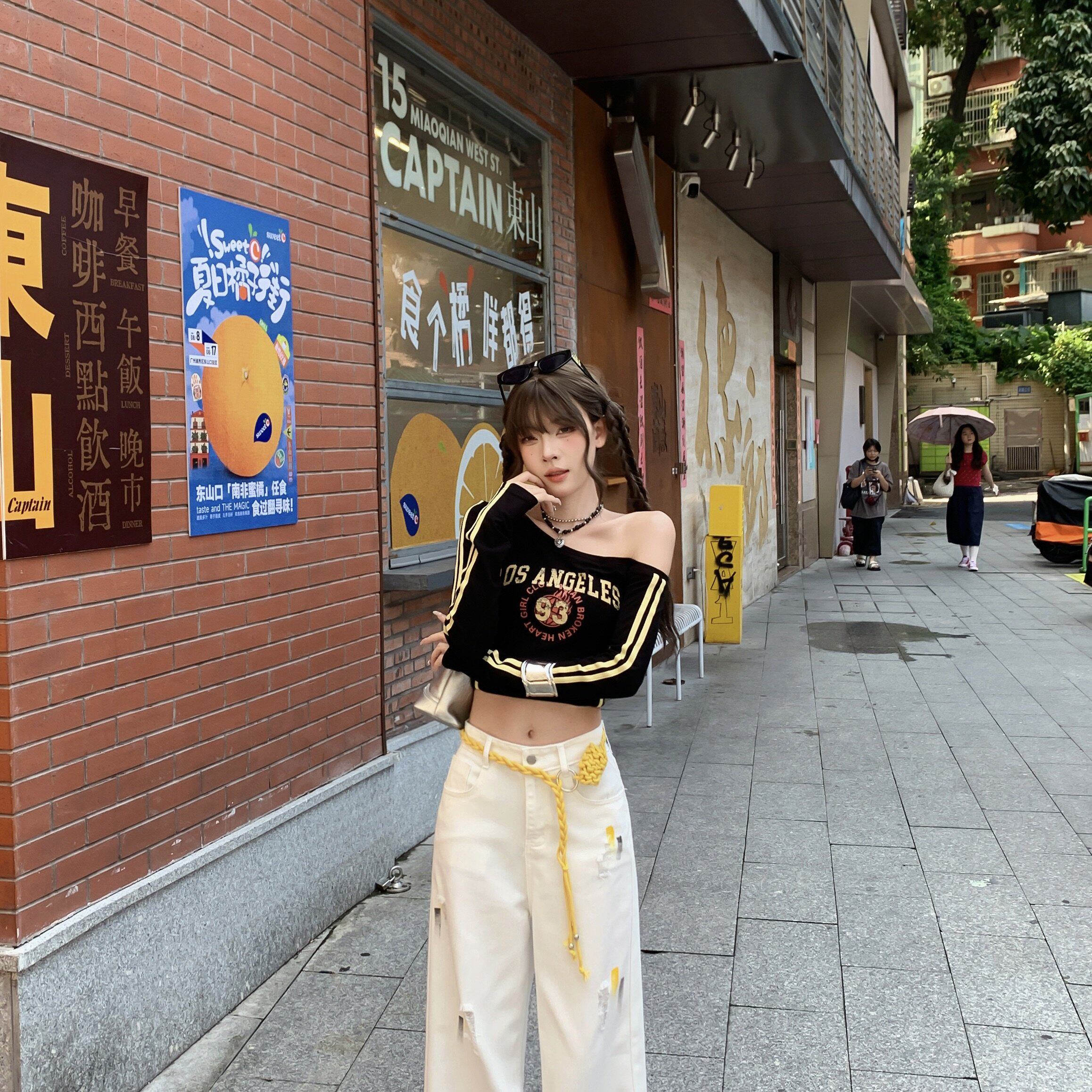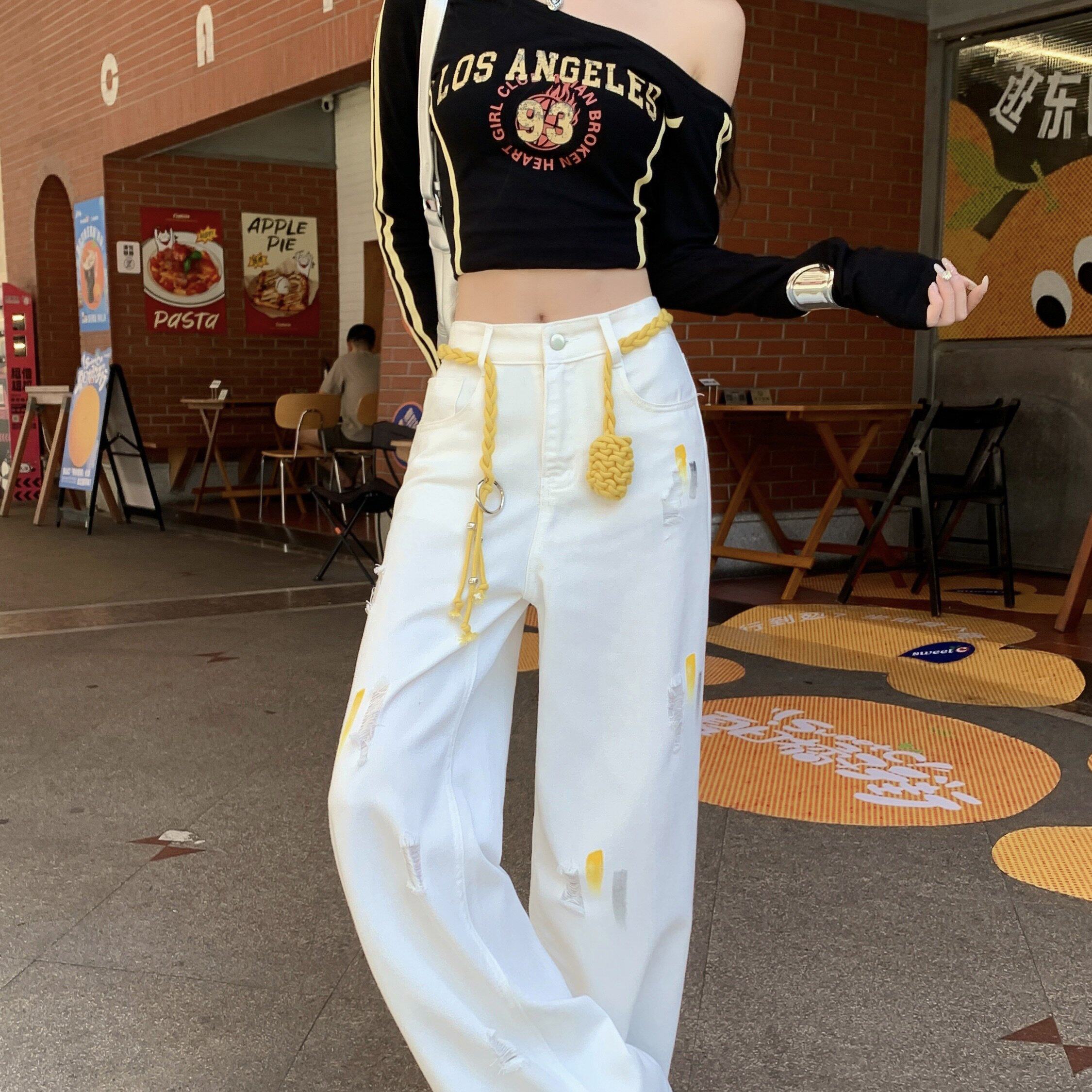 实拍实价 小众设计感彩绘破洞牛仔裤高腰显瘦宽松直筒阔腿拖地裤