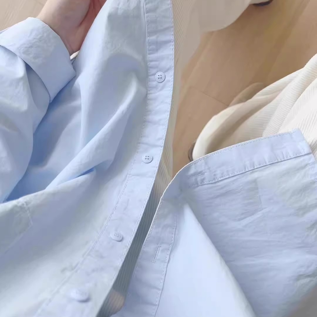 纯棉蓝色衬衫女春秋2025新款翻领内搭长袖衬衣外穿小个子韩系上衣