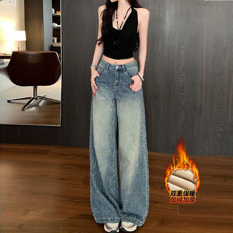李李服饰加绒满天星烫钻爆闪阔腿宽松牛仔裤女2025超火冬季拖地裤