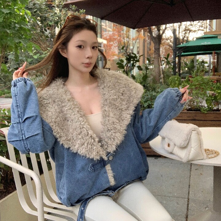 实拍实价 时尚宽松大翻领皮毛一体羊羔毛短款外套冬机车保暖上衣