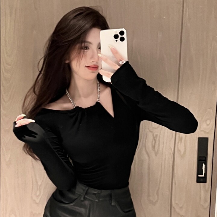实价实拍露肩链条挂脖气质百搭显瘦长袖上衣女纯色T恤
