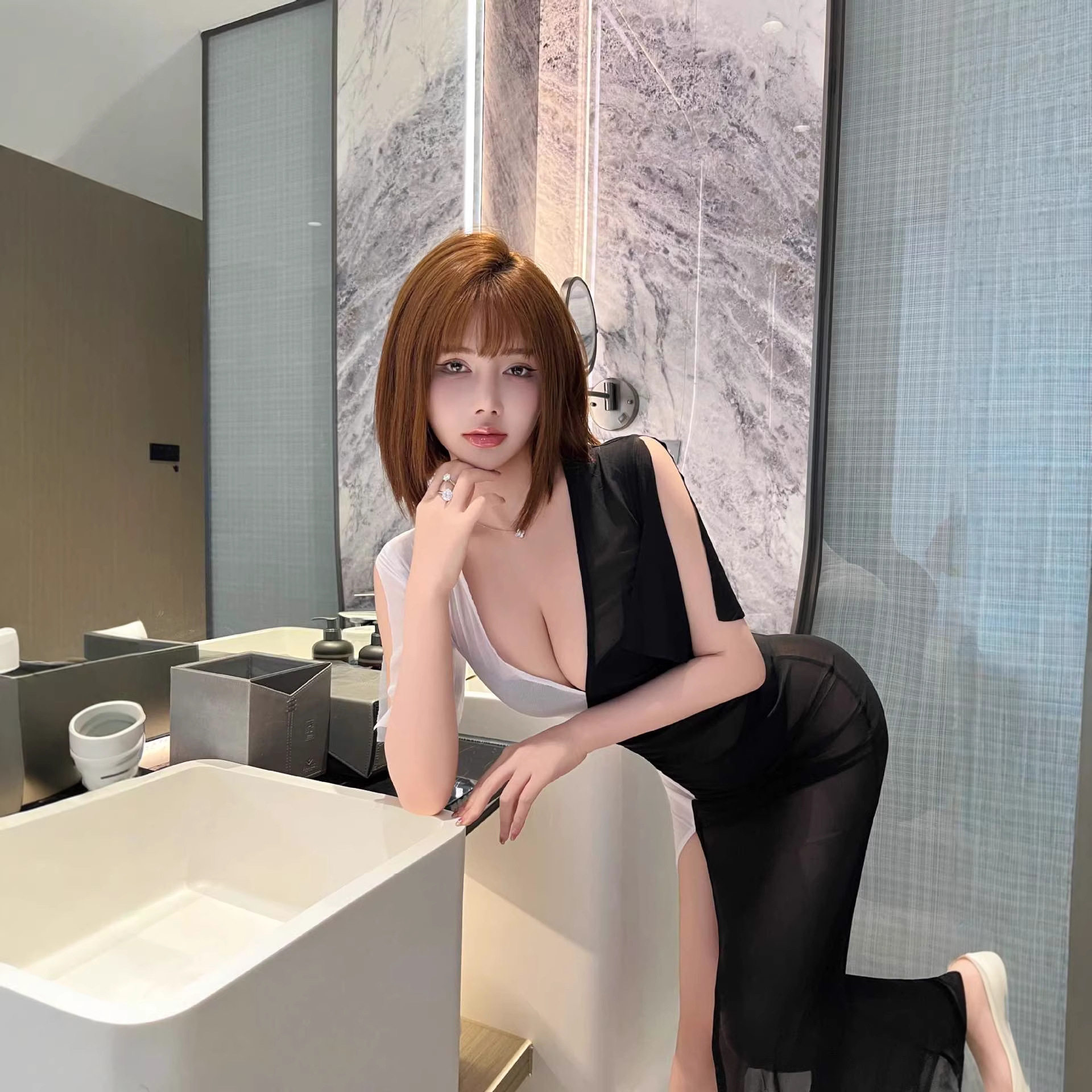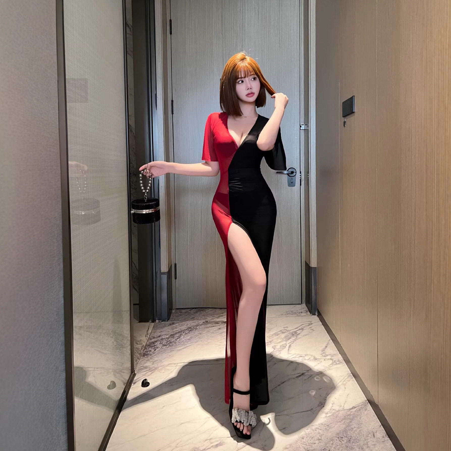 26新款性感网纱透视连衣裙深V漏胸拼色收腰显瘦长裙spa桑拿技师服