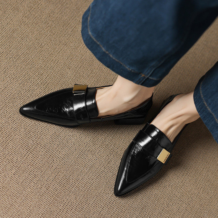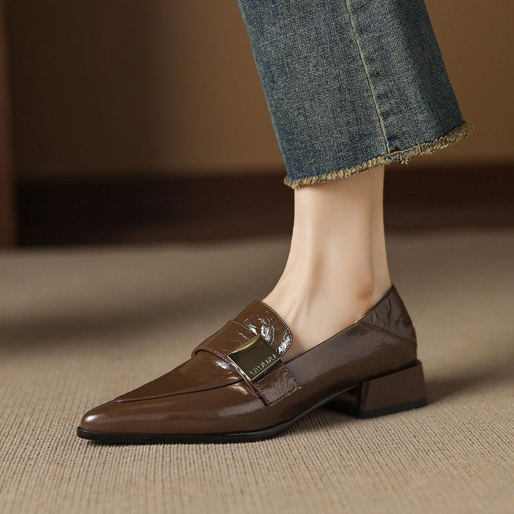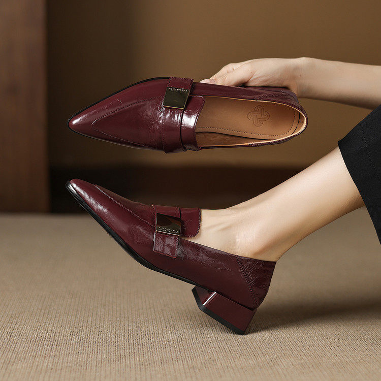 英伦粗跟单鞋女2025春秋款真皮尖头乐福鞋深口酒红色低跟小皮鞋