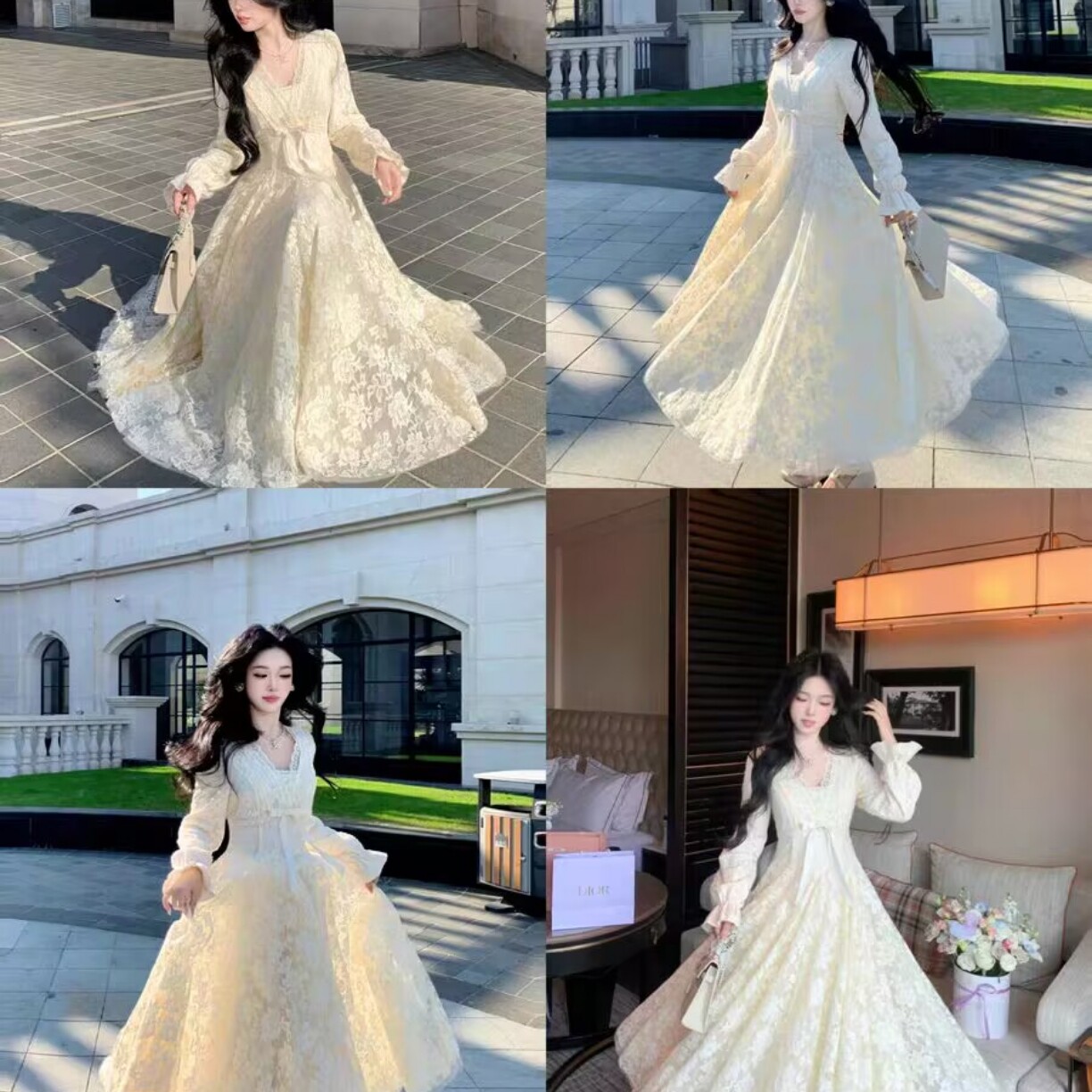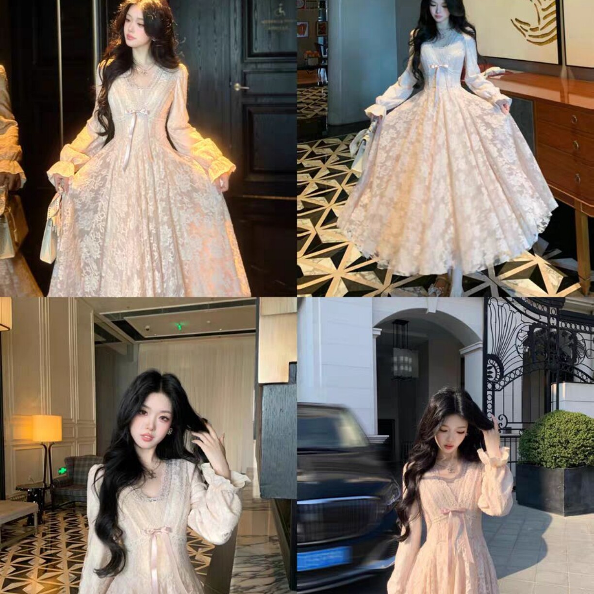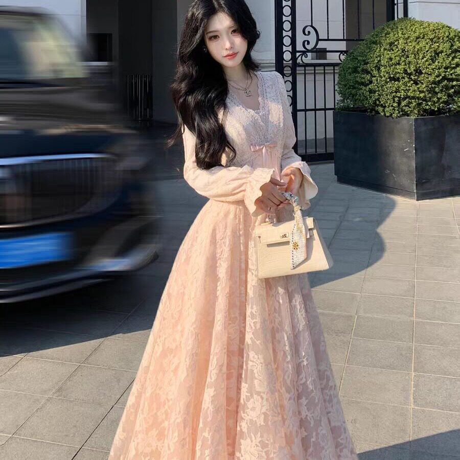 Blovelan迷迭花园 法式纯欲v领蕾丝连衣裙收腰千金风蓬蓬裙加绒