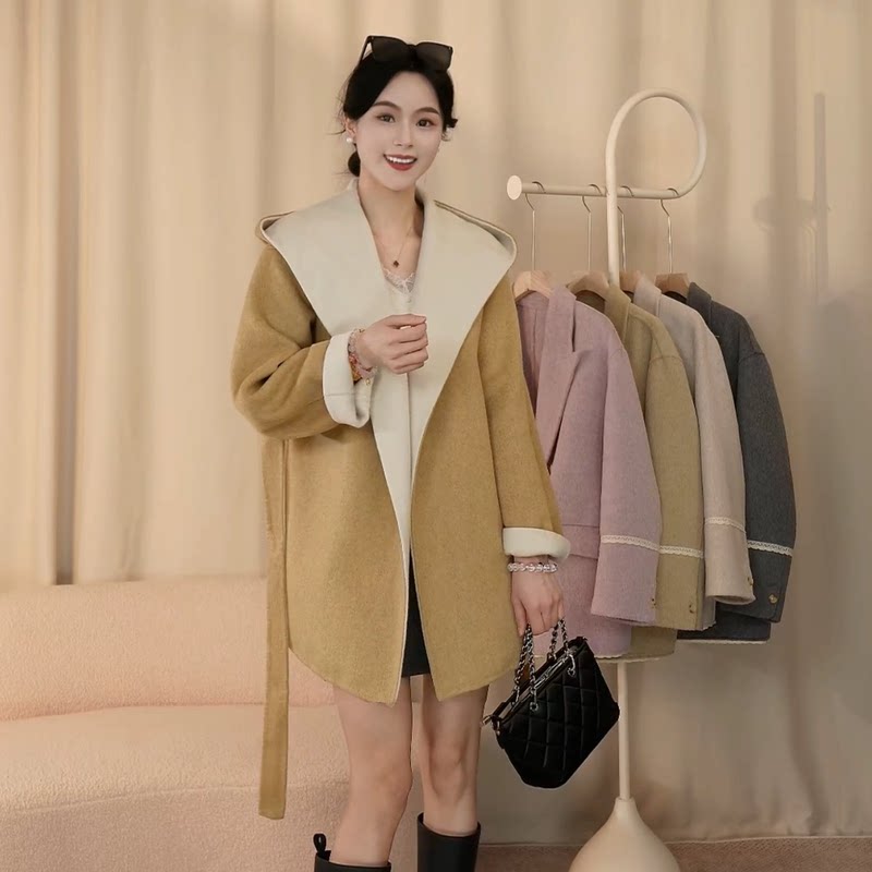 新款时尚羊毛外套秋冬新品可连帽双面羊毛大衣女小个子外套25098